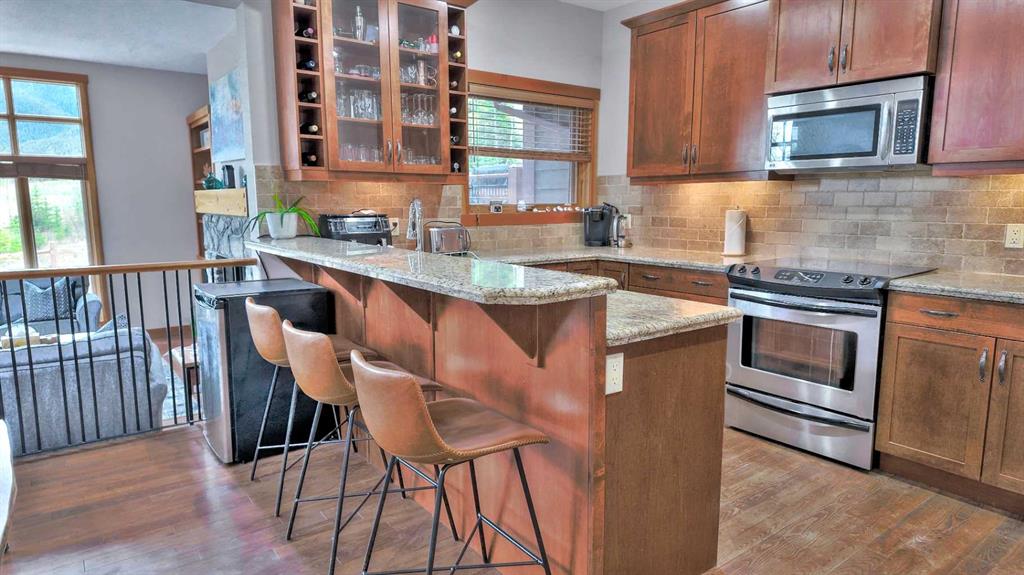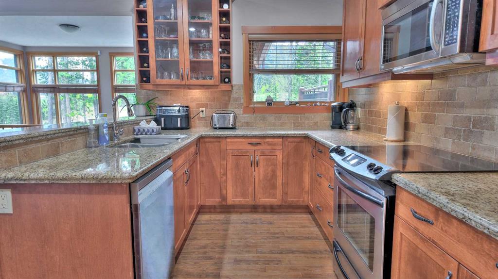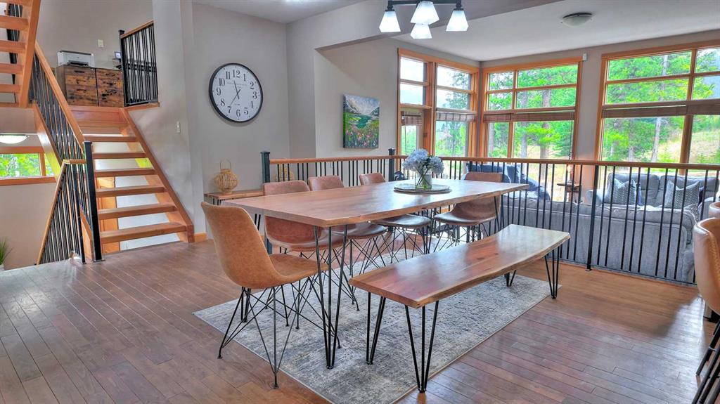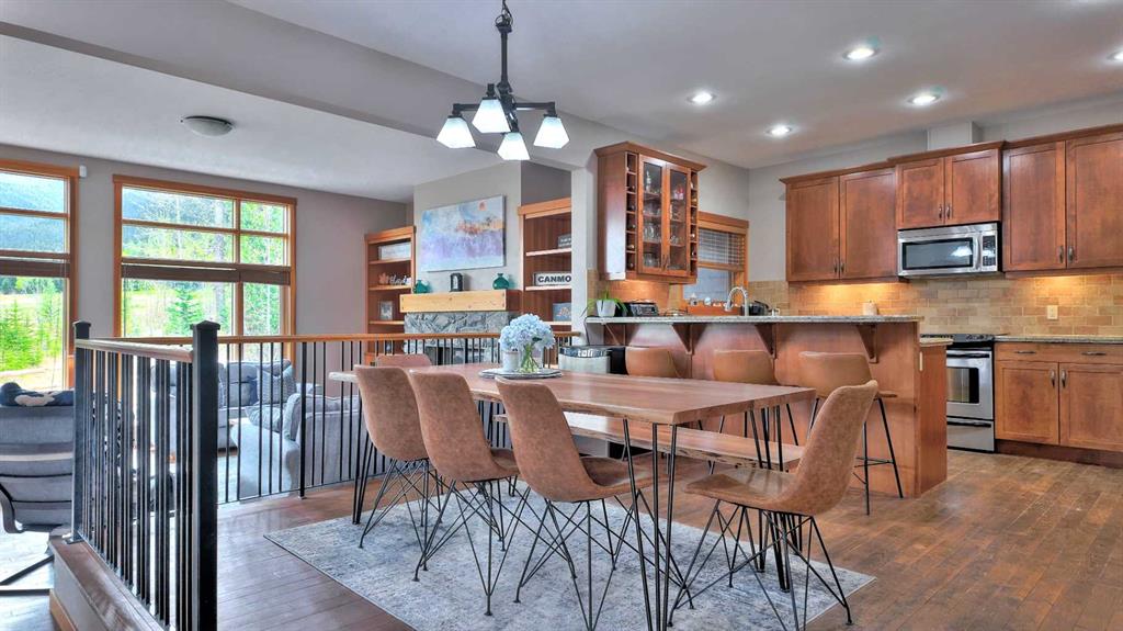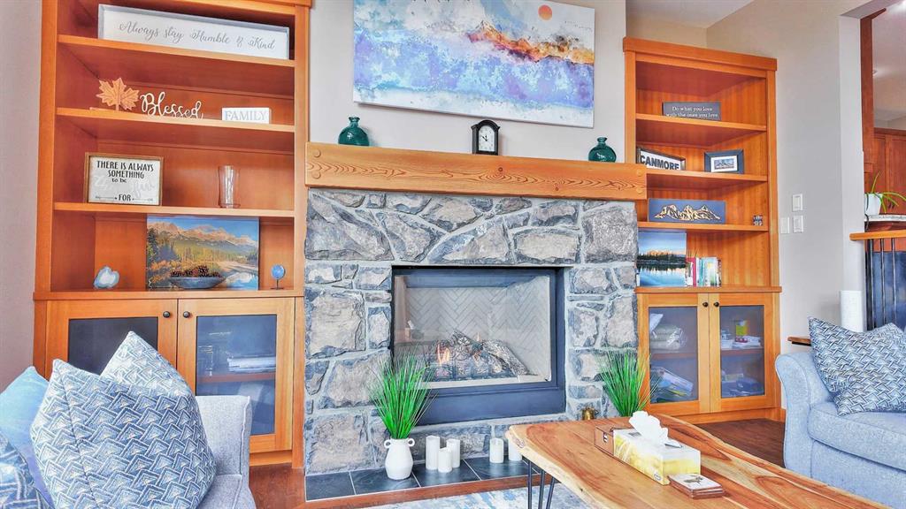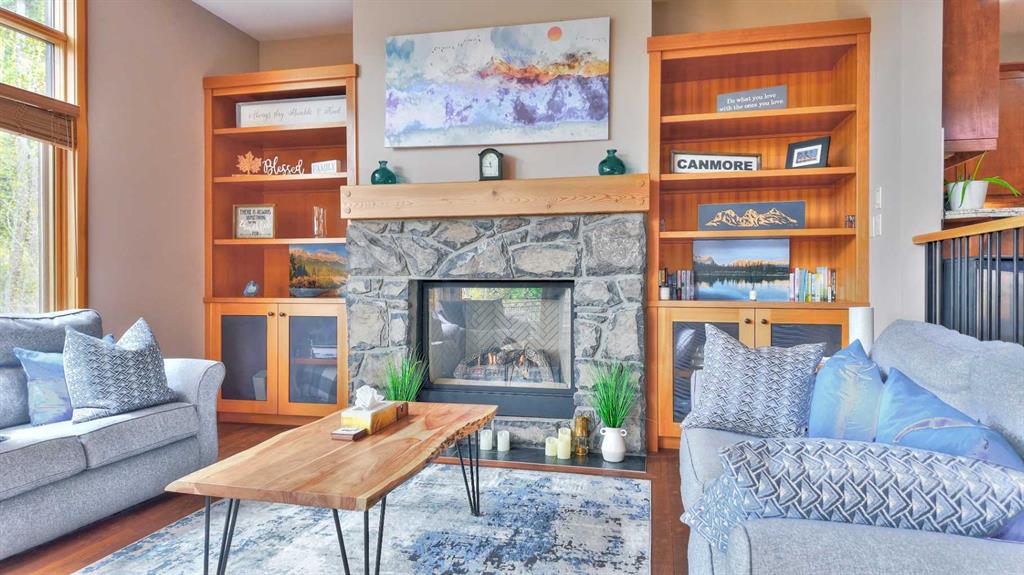 Quick Possession now possible! Welcome to this exceptional multi-level townhome located in a quiet, forest-lined pocket of Canmore, just minutes from Stewart Creek Golf Course. This large 3 bed + den townhouse (Upgradable to 4 bedrooms via a different window hinge for the den) totals 2816sqft and is perfectly positioned for both privacy and views, this beautifully maintained home blends warm mountain charm with thoughtful modern upgrades—offering the ideal base for full-time living or a weekend escape. Step inside to an inviting and highly practical open-concept main floor where rich hardwood flooring and massive windows set the tone. Natural light pours into the living space, where a striking stone-clad natural gas fireplace serves as a cozy focal point for evenings with family or friends. The dining area comfortably fits a large table and opens onto a well-equipped kitchen with granite countertops, stainless steel appliances, and ample cabinetry for storage. Three generous bedrooms plus a separate large den offer comfort and privacy, complemented by three and a half well-appointed bathrooms. The large windows continue throughout, capturing views of surrounding trees and mountain peaks. The lower-level walkout is an ideal flex space—perfect as a media room, guest quarters, or a quiet home office retreat. Enjoy outdoor living with both a sun-soaked balcony off the main level and a private, treed patio from the lower level. Bonus features include central A/C for summer comfort, and a spacious double garage (plus 2 more on driveway) complete with built-in storage cabinets and a handy storage nook for gear or a work bench. With easy access to trails, Nordic Centre, and downtown Canmore, this home delivers the mountain lifestyle you’ve been waiting for—quiet, scenic, and stylish home.