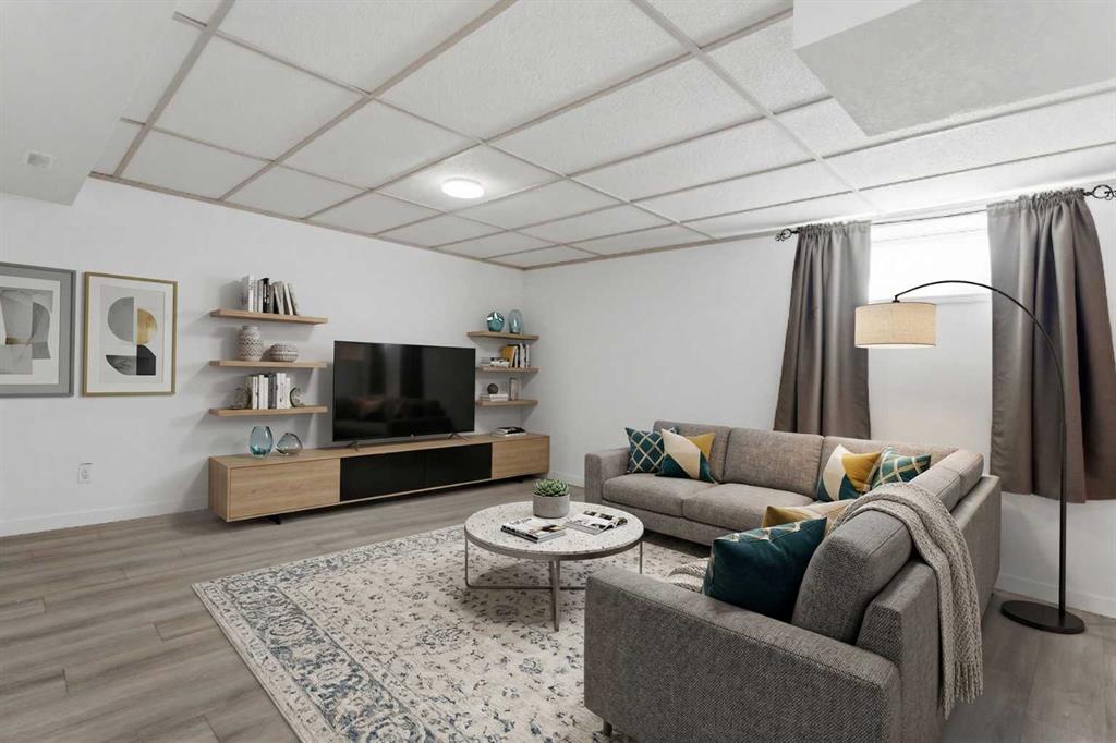 The fully developed lower level expands your living space with a generous recreation room, complete with a dedicated alcove for a home gym, a full bathroom with a shower, and an upgraded laundry area featuring Samsung washer and dryer along with built-in storage.