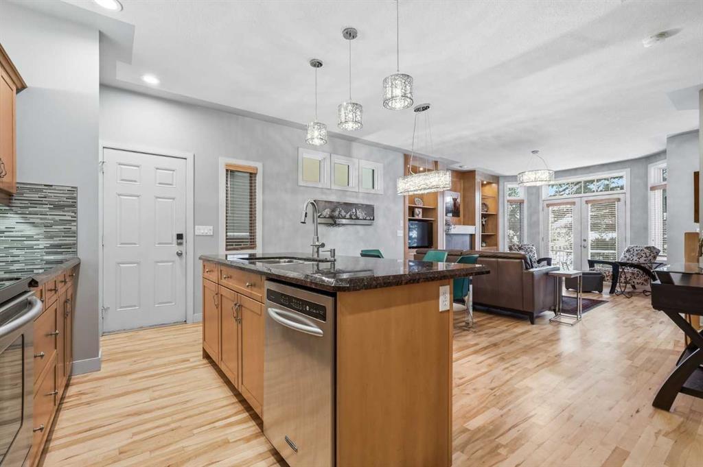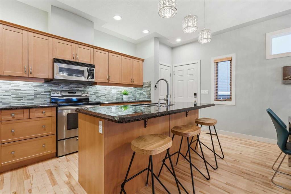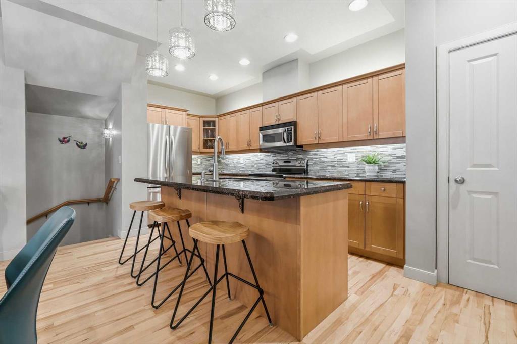 Beautifully updated 2+1 bedroom townhome in sought after Richmond, offering over 1800 sq ft of developed living space. The bright & airy open main level presents hardwood flooring, 9’ ceilings & stylish light fixtures, showcasing the living room anchored by a feature fireplace with black marble surround & built-ins, a casual dining area & kitchen that’s tastefully finished with granite counter tops, eating bar, plenty of storage (including pantry) & stainless steel appliances. The second level hosts 2 generously sized bedrooms & a 4 piece main bath. The primary bedroom features a walk-in closet & private 4 piece ensuite. Laundry facilities are also conveniently located on the second level. Basement development includes a large family/media room, third bedroom & 4 piece bath. Other notable features include a private front patio & effortless parking in a single detached garage. The location is incredibly convenient, close to schools, shopping, public transit & direct access to 17th Avenue & Crowchild Trail.