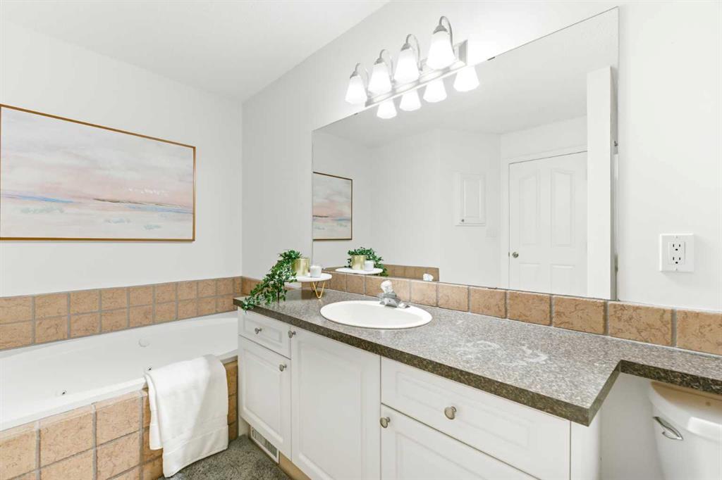 Upstairs, you’ll find two generously sized bedrooms, each with its own walk-in closet and ceiling fan. The upper level also features a spacious 3-piece bathroom with a jetted tub, along with a skylight that enhances the bright, airy feel of the home.
