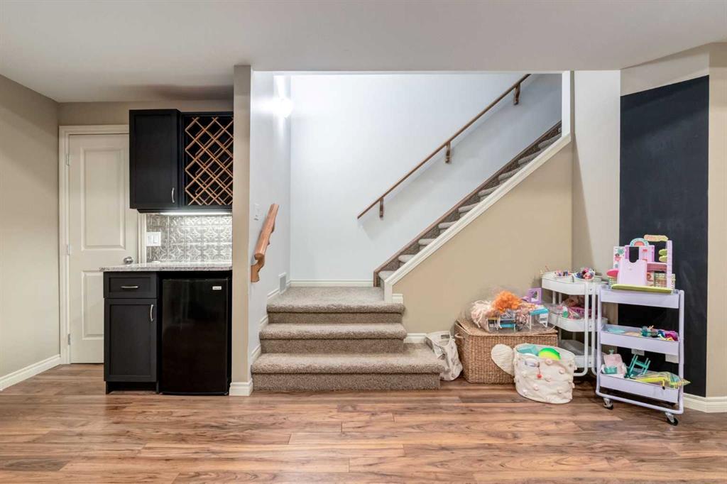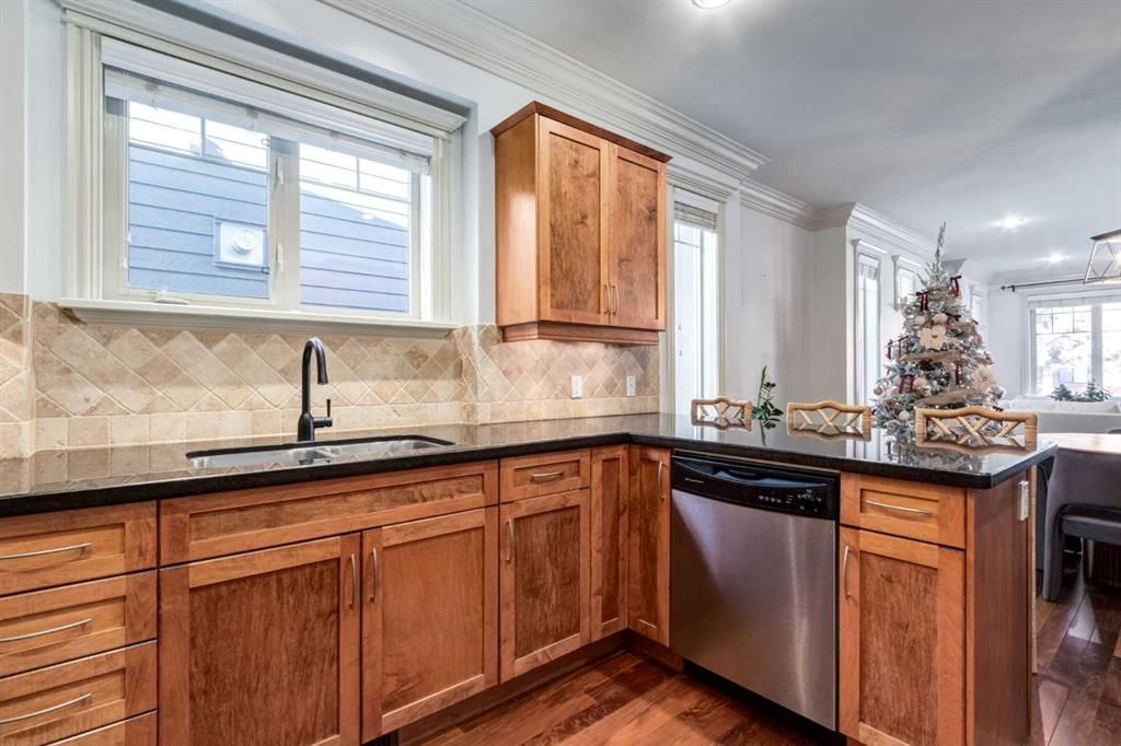 Welcome to the Brownstones of West Hillhurst. Presenting this unique opportunity to own a timeless and traditionally crafted home designed by locally acclaimed architect John Hadden. This highly sought-after location is walking distance to the trendy Kensington district featuring fine cafes, restaurants and retail shops. Minutes away from the University of Calgary and convenient access to downtown, this home is perfect for all demographics. This exceptional 3-bedroom front unit offers over 2100 square foot of living space, enhanced by luxurious finishes, soaring 9’ ceilings, crown moulding, recessed pot lighting, exquisite trim and hardwood floors. The home opens effortlessly into the living room featuring a cozy stone faced gas fireplace with mantle and overlooks your private north facing fenced patio allowing for abundant sunlight, creating a bright and welcoming atmosphere. Beyond the living room you will find the dedicated dining room which flows into a culinary dream. The impressive gourmet kitchen features a gas range and convection oven, 20 amp outlets, under-cabinet lighting, Frigidaire Gallery stainless steel appliances, built-in drawer microwave, shaker panel stained maple cabinets and rich granite counters. The laundry room with wash sink and 2-piece bathroom complete the main floor. On the upper level, the primary bedroom is detailed with elegant wainscoting, vaulted ceiling with remote operated ceiling fan and walk-in closet with custom organization. The spa inspired 5 piece ensuite features dual vanities, an oversized soaker tub and a standalone glass shower. The second bedroom includes 2 large closets and jack-and-jill 4-piece bathroom. Venture into the fully finished basement, a flexible space ideal for relaxation, entertainment or extra workspace. Here you’ll find a generous recreation room featuring a dry bar with bar fridge, wine rack and granite counter top. An additional bedroom with private 4-piece bathroom, large storage room and utility room completes this lower level. Low monthly condo fees take care of all exterior yard maintenance, irrigation, snow removal, garage utilities and more. Welcome to a thoughtfully designed residence that offers a traditional style with an exceptional location —welcome home to the Brownstones.