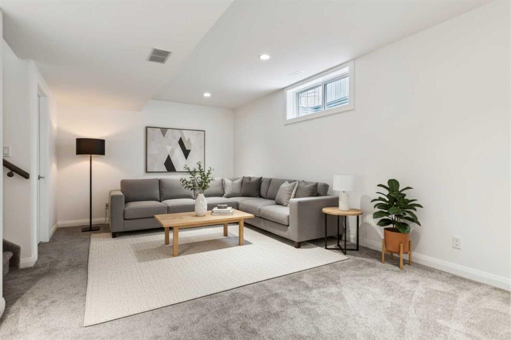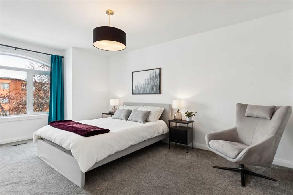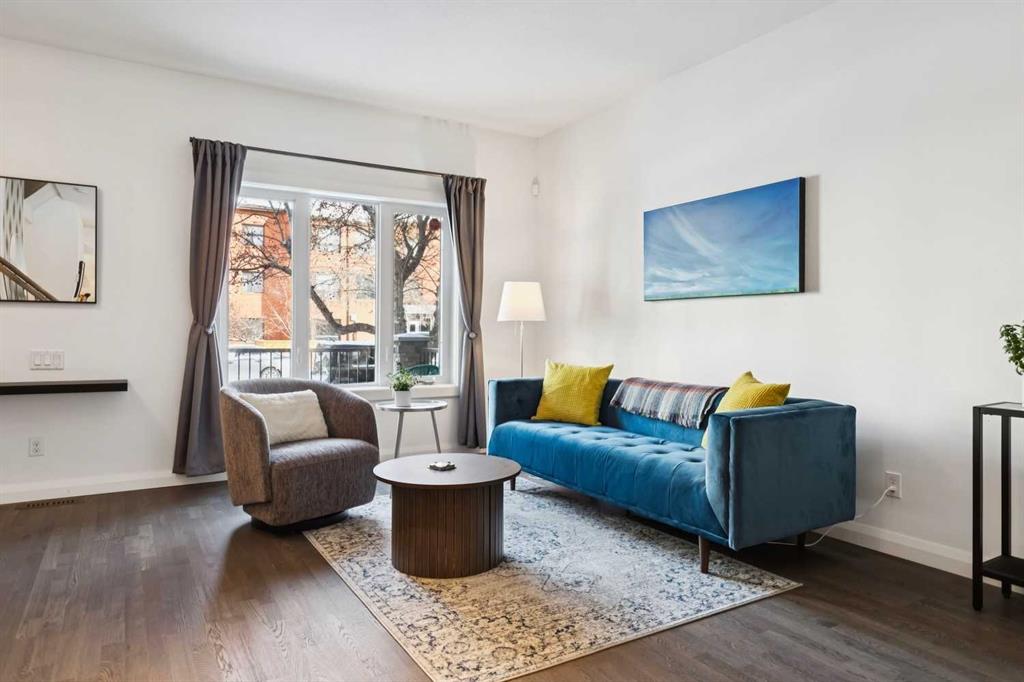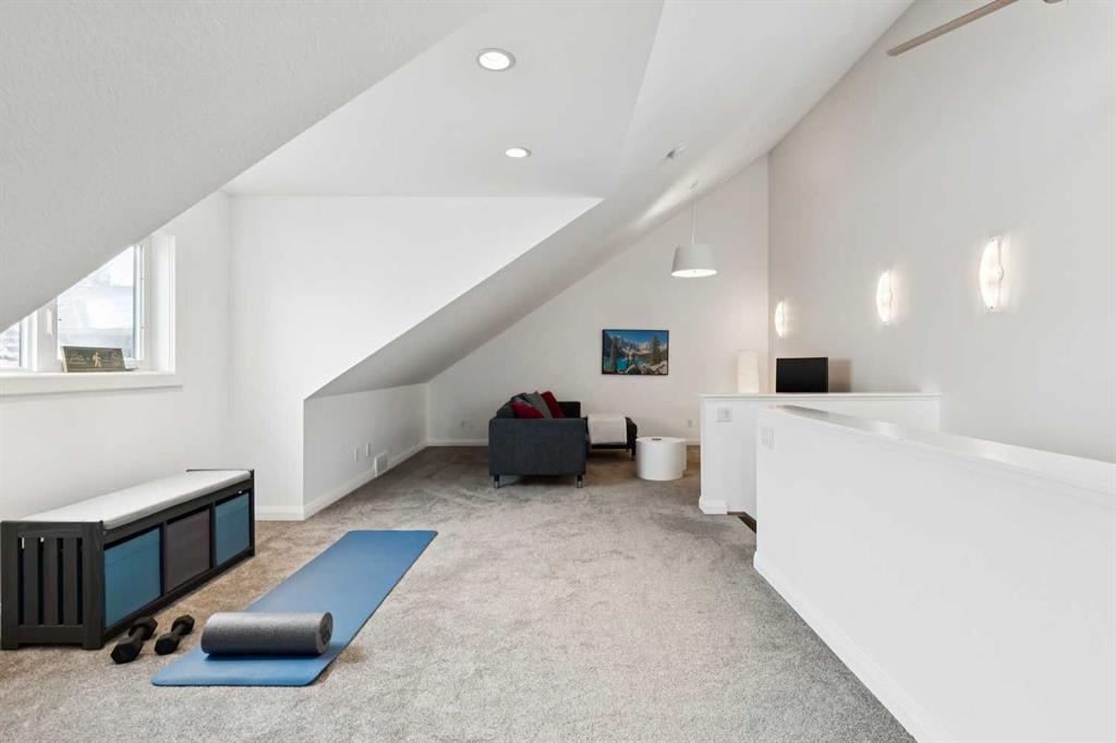 Looking to enter West Hillhurst, but don’t want to sacrifice space or quality? Welcome to #1, 2421 2 Avenue NW: a beautiful front-facing 3-storey townhouse in sought-after West Hillhurst offering over 2,500 sqft of total living space, including a fully developed basement. The home sits at the front of the complex with a welcoming front deck and aggregate concrete exterior, and includes one stall in the detached garage off the back lane along with a visitor parking pad. The main floor features 9-foot ceilings, an extra-wide front door, hardwood flooring, and an open-concept living room, dining area, and kitchen, plus a convenient half bathroom with quartz countertops and tile floors. The kitchen includes stainless steel appliances, an in-wall oven, an induction stovetop with range hood, quartz countertops, pantry storage, a bar fridge, and a microwave replaced in 2023. Soundproofing between units is exellent, and solid doors are installed throughout the home. On the second floor, you will find 2 carpeted bedrooms, laundry, and a full bathroom with quartz countertops, tile floors, and a tiled tub/shower combination. The primary bedroom also includes a large private ensuite with dual sinks, quartz countertops, a tiled shower, and a large soaker tub. The incredible top floor is a bright and versatile space with vaulted ceilings, skylights, a ceiling fan, and a Juliet balcony, making it ideal for a bedroom, office, workout space, playroom, or media room. The developed basement offers new carpet, a large rec room with wet bar, a spacious bedroom, and a full bathroom with quartz countertops, tile floors, and a tiled tub/shower combination, along with the boiler system. Carpet throughout the top two floors and basement was replaced in 2022, and shingles were replaced in 2023. Maintenance fees are a low $418 per month and include reserve fund contributions, snow removal, annual exterior window cleaning, exterior insurance, and electricity for the garage. Located in the highly desirable community of West Hillhurst, this home is within walking distance to the amazing Bow River pathway system, close to a grocery store, and near several schools and local amenities, with quick access to downtown and Kensington. Book your showing before it’s too late!