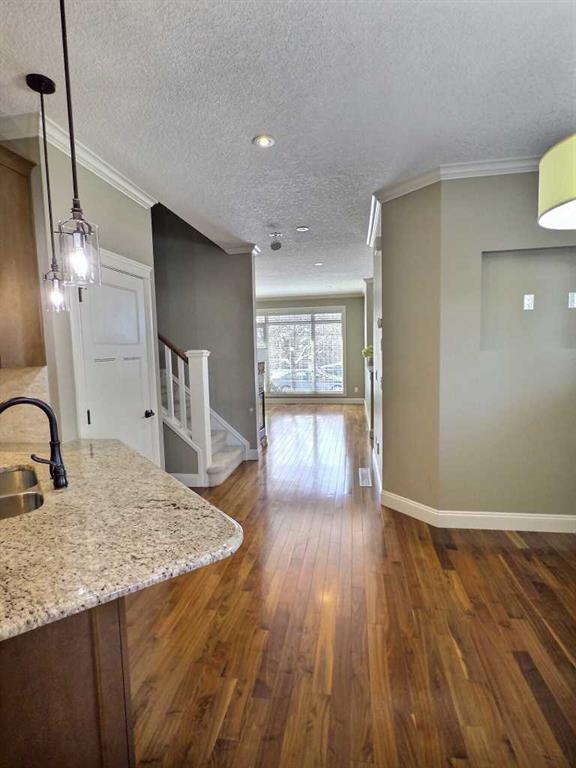 Welcome to this bright and beautiful front unit featuring 2 bedrooms, 2.5-bathrooms in this highly sought-after location. With almost 1,400 sq. ft. of well-designed living space, this property offers exceptional comfort and style. Gorgeous acrylic stucco, stone work aggregate walkways and mature trees, give this home amazing curb appeal. Both master bedrooms feature their own 4-piece ensuite bathrooms and large walk in closets, making it ideal for privacy and convenience. Enjoy the beautiful downtown skyline view from the front bedroom. The main floor is graced with stunning hardwood floors and a cozy gas fireplace that adds warmth and charm. 9-foot ceilings throughout the main level provide an open, airy atmosphere. The kitchen is a dream with ample storage, a huge pantry, loads of counter work space, stainless steel appliances, and beautiful granite countertops, along with a generous sized dining area perfect for dinner parties. The home is equipped with a vacuflo system, including attachments as well. Outside, you can have a BBQ off your front porch, which is very private with the beautiful trees. You will also find a detached garage offering a single titled parking space, perfect for those cold winter months. There is additional street parking available for guests and one guest parking spot in the back. The full basement, though unfinished, is full of potential, with a large window providing natural light, rough in for bathroom and the possibility for your future needs. New hot water tank installed in 2026. Don’t miss the opportunity to make this wonderful home yours. Schedule a viewing today!