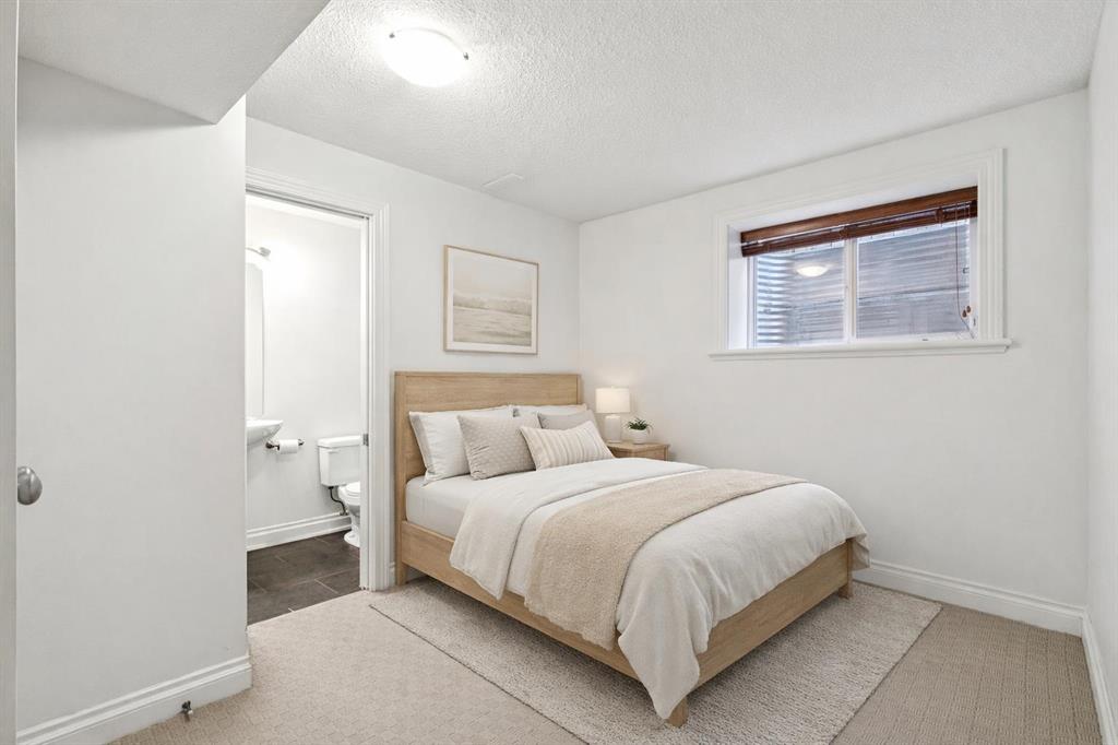 The fully finished basement expands the living space with a second gas fireplace in the sitting or recreation area, plus a third bedroom with its own ensuite — ideal for guests, a home office, or extended family. (Yes — every bedroom in this home has its own ensuite.) Additional storage and a tidy utility room with built-in shelving complete the lower level.