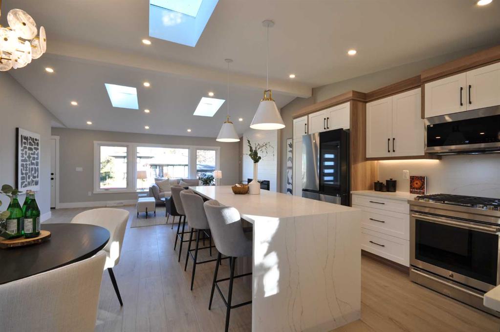 Wow, this modern 4 level split has been completely restyled and renovated top to bottom WITH 2940 SQ FEET OF DEVELOPED LIVING SPACE on 4 levels. As you step inside you will see the spacious great room with stunning new vaulted ceilings complete with skylights which bring in an abundance of natural light. Luxury vinyl flooring flows throughout the main floor and into the third level and hallways throughout. Feature electric fireplace adds ambiance to this warm living space. The kitchen sports 2 toned cabinets, eat up island with waterfall quartz top, and easy access to the private and treed west yard either through the garden doors or the adjacent mud room. The mud room features ample storage and this level is complete with a 2pc bathroom. Upstairs you will find the primary bedroom with a 4 pc bathroom generous walk in closet, as well as an additional bedroom and main bathroom. Steps down from the kitchen is the family room complete with a large wet bar, second fireplace and a large picture window flooding this room with more natural lighting. Adjacent to the family room is the perfect space for a sunny home office, an additional bathroom and conveniently located laundry. A few more steps down to the lower level you will find 2 more bedrooms, exercise room/office/playroom, bathroom and mechanical/storage room. All new mechanicals, plumbing and electrical throughout. The exterior has been completely replaced with new exterior stucco, soffit, fascia, windows and trendy vertical metal cladding. The double garage is also brand new. Large front porch and back deck provide amazing outdoor living spaces just off the main level. Close to Chinook bilingual elementary school, Henry Wise wood High School and Calgary Jewish Academy. Located a few blocks from numerous amenities, such as shopping, the Rockyview Hospital, playgrounds, transportation and Glenmore Reservoir. Really nothing left to do but move in and enjoy.