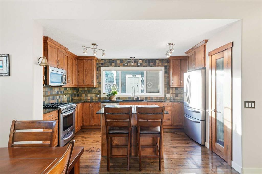 The main floor comes with gorgeous hardwood and a main floor fireplace. The kitchen and dining connect while allowing a spacious prep area and newer stainless appliances. An easy two steps takes you outside to a large south-facing deck built for BBQs, family dinners, and relaxed weekends. The deck connects directly to the detached garage, keeping everyday routines simple.