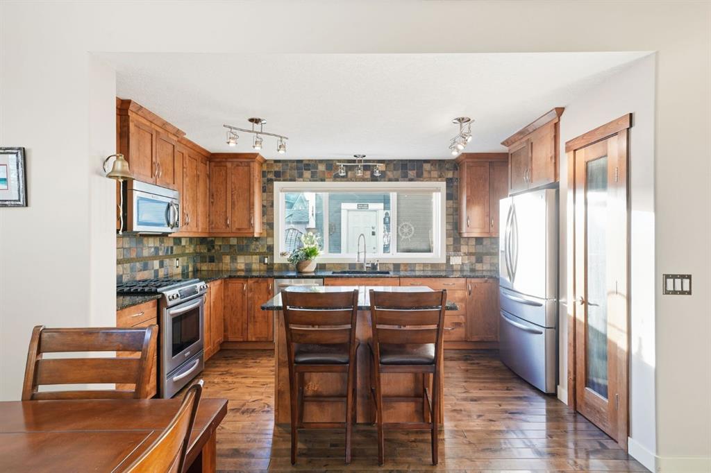 Step inside and you’ll immediately notice the warmth created by distressed hardwood floors, 9’ knockdown ceilings, & rich alder millwork throughout the main level. The heart of the home is the impressive island kitchen featuring granite countertops, full-height cabinets, and a striking slate backsplash above the sink. Quality stainless steel appliances include a DUAL-FUEL GAS STOVE with electric oven, KitchenAid dishwasher, & newer premium fridge — perfect for family meals or entertaining.