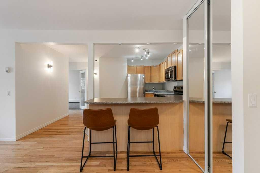 Incredible value within this spacious two-bedroom condominium in the heart of Mission. Recently updated, this home boasts a bright, open floor plan featuring a very large main living area, open kitchen, and large dining area. Also, there are two good-size bedrooms, including the primary with a spacious closet and upgraded 3-pce ensuite bathroom. This home also features an upgraded main 3-pce bathroom and an in-suite laundry closet. An incredibly rare feature is the ‘double wide’ balcony which overlooks a city park with community garden. This lovely home also comes with a view of downtown and the Calgary Tower. There are two parking stalls included. One is a covered stall with gated access. The other is an outdoor stall. Other benefits include hardwood and tile floors, brand new bathroom fixtures, and fresh paint throughout. Interior French doors, new lighting, separate storage cage, a short walk to Mission District, boasting restaurants, shops and more, downtown core, Stampede Park and Lindsay Aquatic Center. C-Train and city transit close by. This home