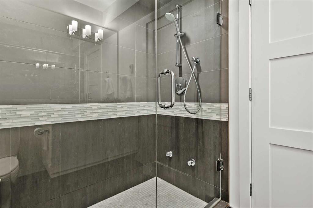 The top level welcomes you with a grand foyer and leads to a true primary retreat, an inviting sanctuary featuring a spacious walk-in closet and a beautifully appointed ensuite with dual vanities, a glass-enclosed shower with dual shower heads, and a river rock base. A private west-facing terrace offers a peaceful outdoor escape. This level also features a versatile flex space with custom built-ins ideal for a home office, library, or fitness area & direct access to the oversized double attached heated garage with new epoxy floors (2025).