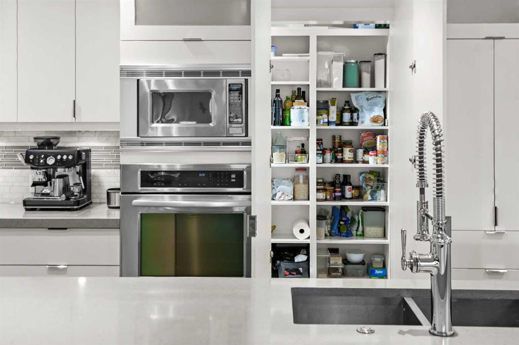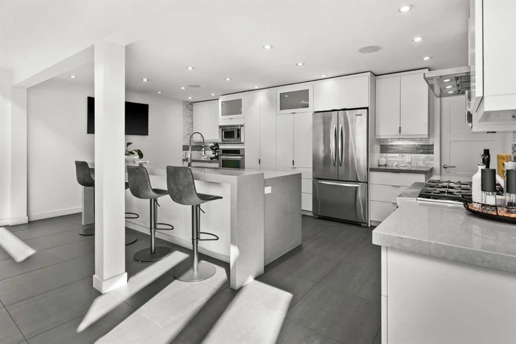 The lower level continues to impress with an additional recreation & entertaining space, a second fireplace & expansive wet bar featuring a wall oven, microwave, wine fridge, & dishwasher. A full bathroom & access to the mechanical room add further functionality. Seamless access to a large west-facing patio with a gas BBQ hookup creates effortless indoor-outdoor living.