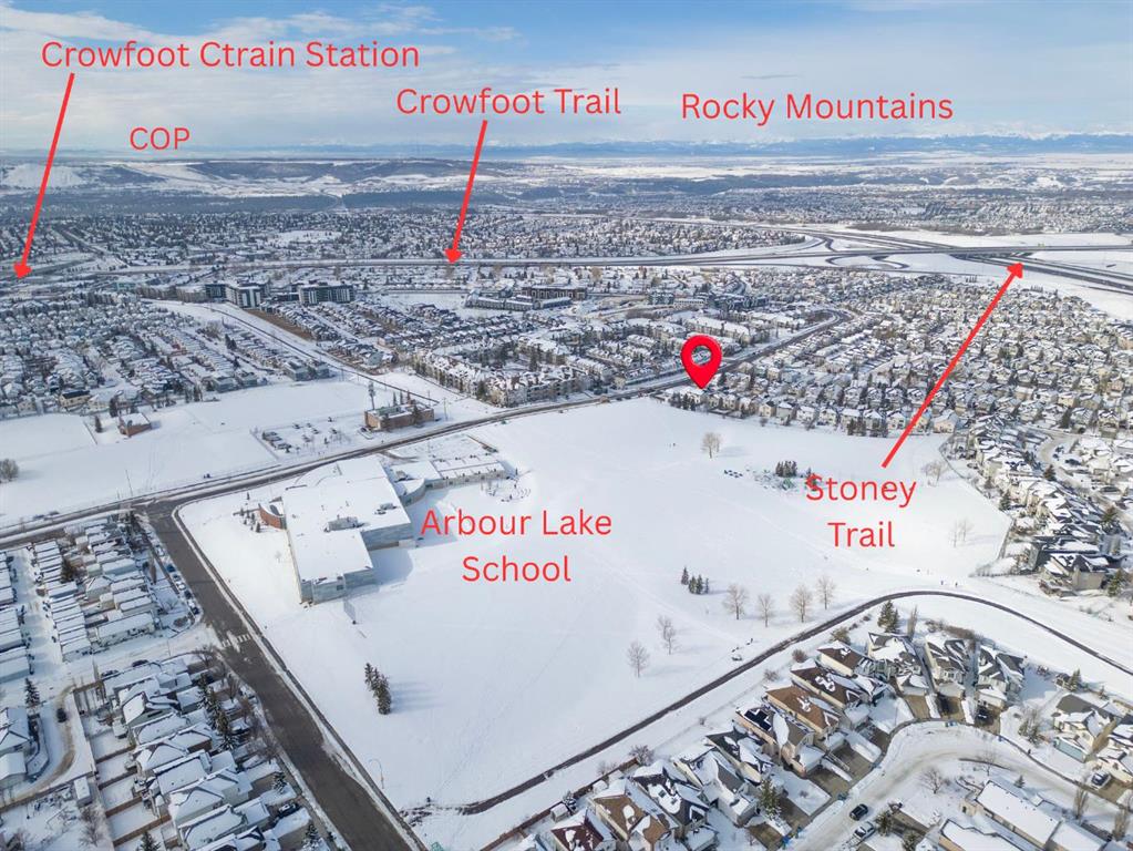 Welcome to this well-maintained home with mountain views from upstairs bedrooms and east facing backyard beside School Playground located in the highly sought-after Only Lake Community of Arbour Lake in NW Calgary. Just 4-minutes walking distance to Arbour Lake School (G5-9), 8-minutes to St. Ambrose School (K-G9) individually and 10 minutes to the community amenities. The main floor provides open concept layouts with a flexible room, a formal dining room with a big side window, a high ceiling living room with large east facing bright windows allowing for tons of natural light in, an updated Kitchen with SS appliances, a large island and a walk-in pantry, and a spacious breakfaster area with a French Door leading to a nice composite deck (2020) to the backyard for outdoor entertaining, a 2-piece powder room and a laundry room leading to the Double Garage. You are impressed by a grand staircase with iron railings leading to the upper floor. It provides a primary bedroom with an east facing large window towards the school playground and to take in the morning sunshine, a walk-in closet, and a 4-piece En-Suite, another two west facing bedrooms with gorgeous mountain views and a family 4-piece bathroom. The basement is unfinished with lots of potential to renovate in the future. The updates include Garage Door (2012), Roof (2013), Interior Paint (2014), Electric Car Charger Circuit (Permit-2019, does not come with Charge Point Charger), Natural Gas Outlet (Permit 2020), Furnace and Humidifier (2022), Newer A/C, Newer Water Softner and Tinted Windows. Arbour Lake offers a great community life, and amenities including year-round lake access for water sports, swimming, skating, tennis courts etc., playgrounds, schools, walking/biking paths, YMCA, Library, Crowfoot Crossing, and the Crowfoot LRT Station. Easy access to major commuting routes such as Crowchild Trail and Stoney Trail to U of C, Downtown, COP and National Parks etc. Call now for your own viewing!