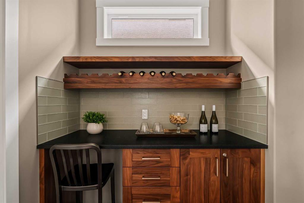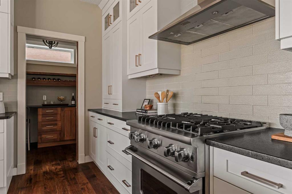 The main level showcases a private home office with sliding pocket doors provides a quiet workspace, while the butler’s pantry connects seamlessly to the show-stopping gourmet kitchen. Here you’ll find soft white full-height cabinetry, stone countertops, & a premium stainless steel built-in appliance package, highlighted by a Viking gas stove & oven & chimney hood fan. The oversized centre island with prep sink anchors the space, offering plenty of room for gathering and entertaining.