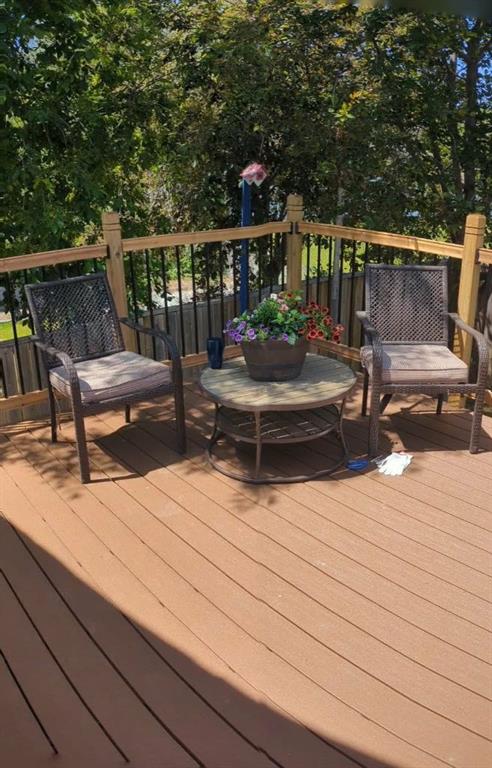 Step outside to a private backyard with no neighbours behind, offering extra peace and privacy. The outdoor space includes a deck with storage underneath, a patio area, and a shed for additional storage.