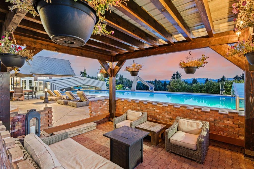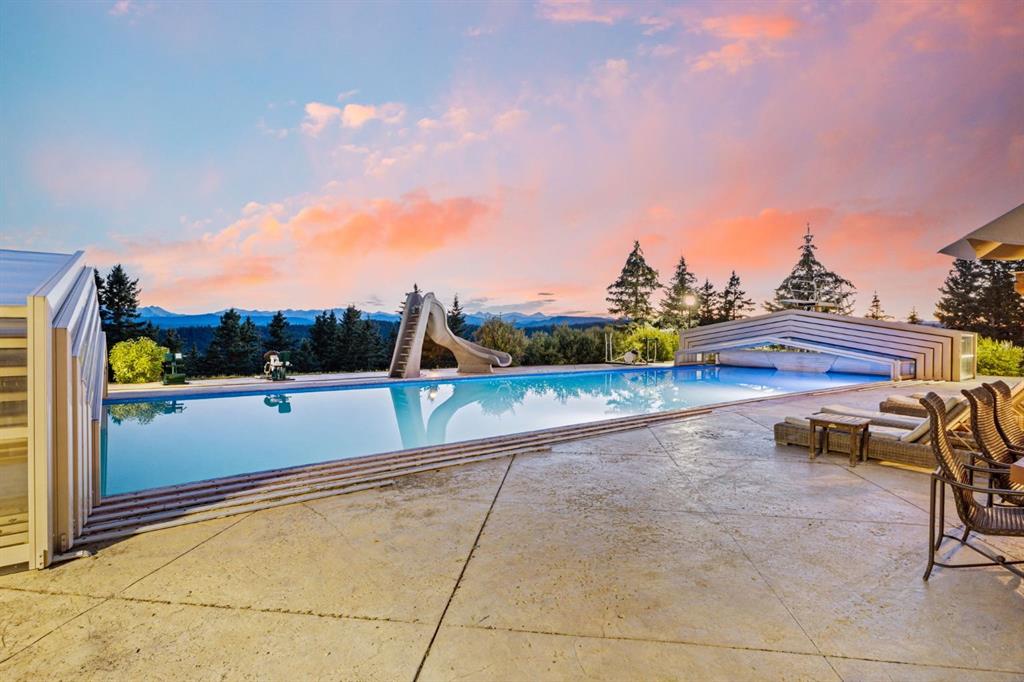 The estate is designed for year-round enjoyment, featuring a 24×80 heated outdoor saltwater pool enclosed within a custom glass structure. This impressive pool—measuring four meters at its deepest point—includes a 10-foot diving board, a slide, and panoramic 180-degree mountain views. Heated flooring surrounds the pool area, while a beautifully designed pergola provides the perfect space for entertaining. Adjacent to the pool, the pool house offers added convenience, complete with a kitchenette, a loft, washer/dryer, a/c, and a bathroom featuring a steam shower.