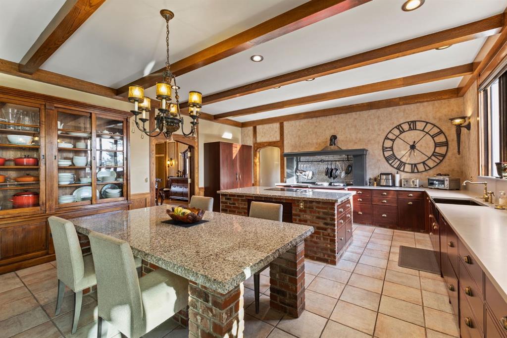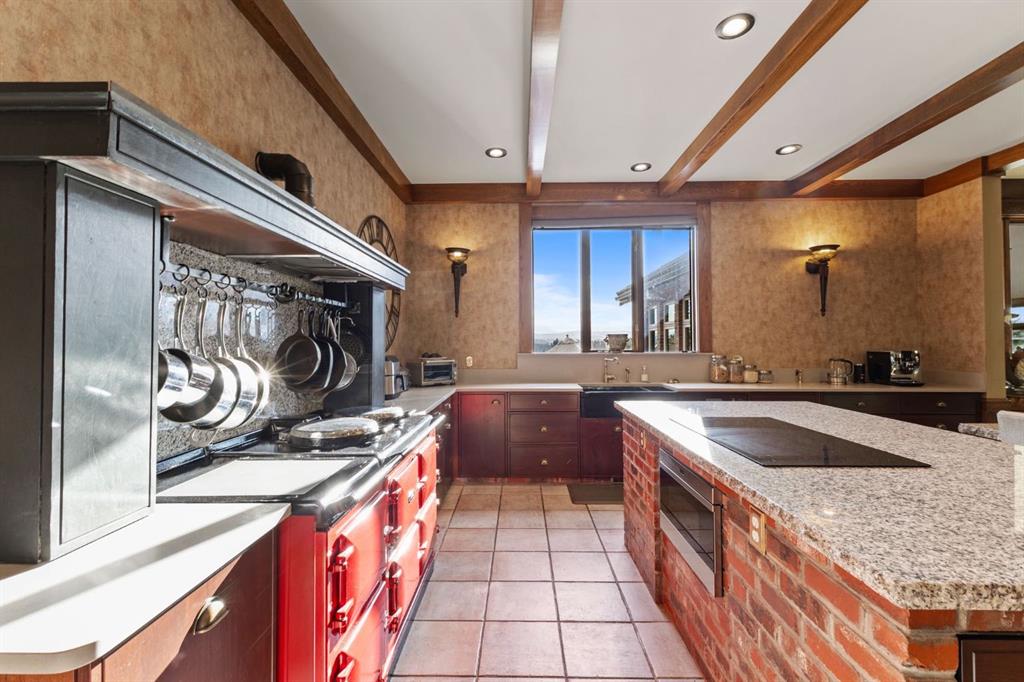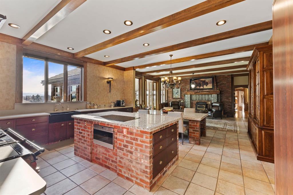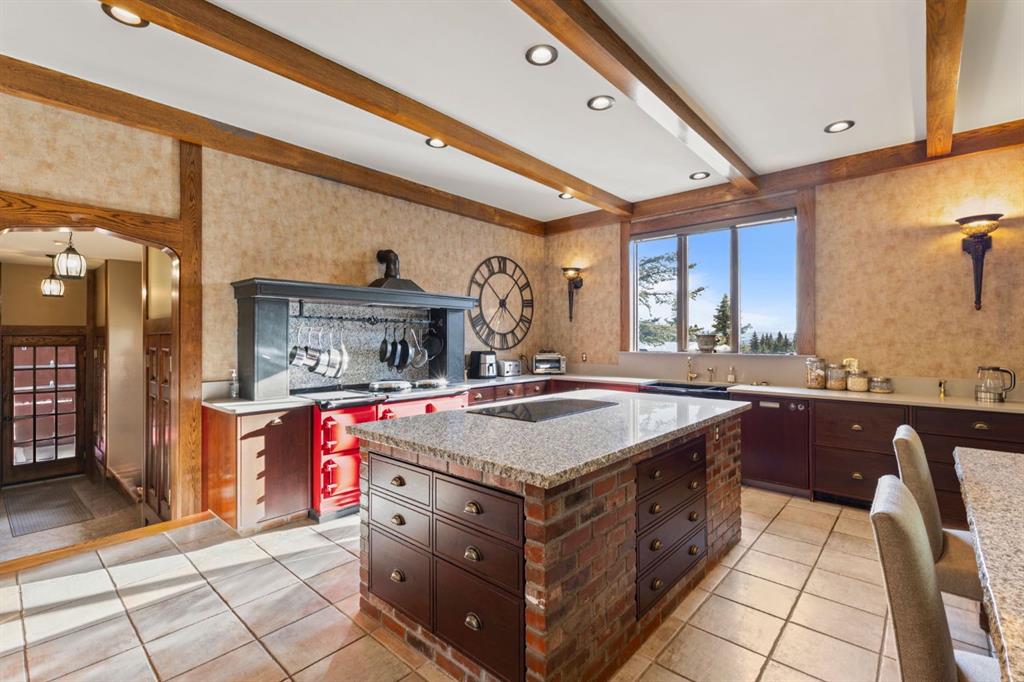 The chef’s kitchen, features an open-concept layout with beamed ceilings, a unique brick island and dining table, a rare AGA range and high-end built-in appliances blend seamlessly with the custom cabinetry. The main-floor primary suite is a true retreat, boasting a grand gas fireplace, spectacular mountain views, and an opulent ensuite with separate his-and-her bathrooms, walk-in closets, dual showers, and a stunning clawfoot tub as the centrepiece.