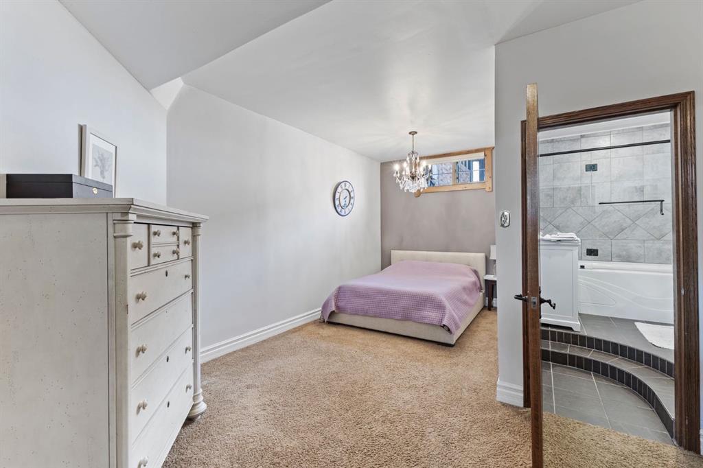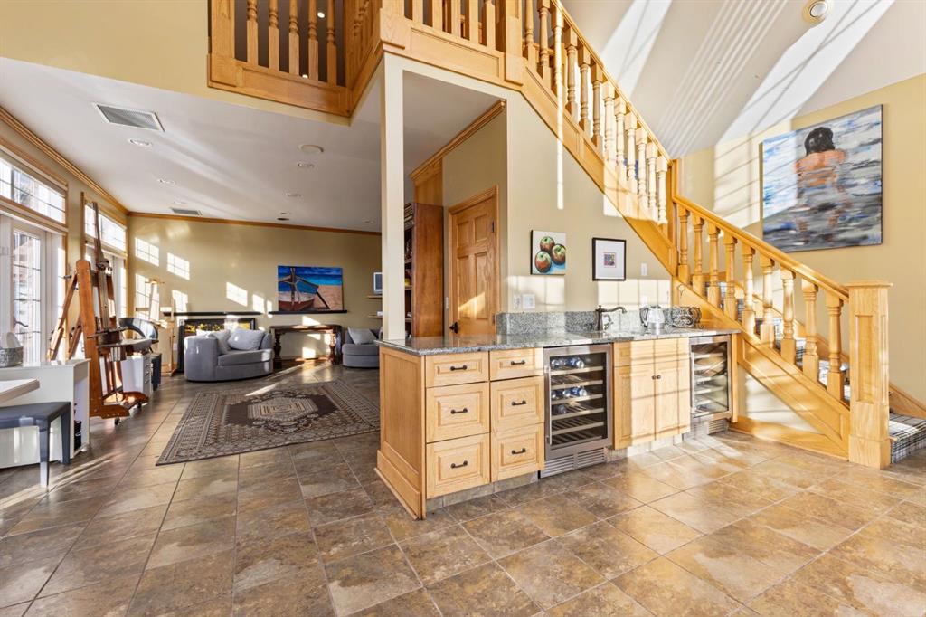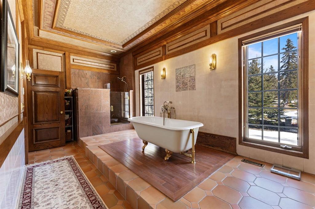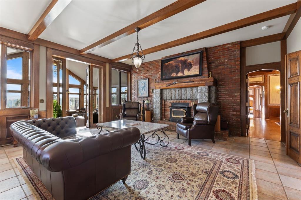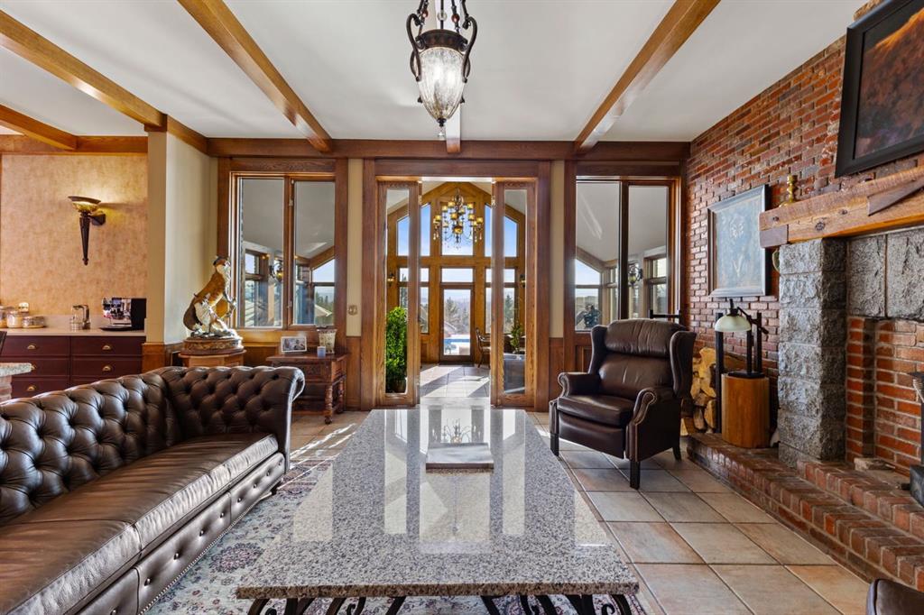 The chef’s kitchen, features an open-concept layout with beamed ceilings, a unique brick island and dining table, a rare AGA range and high-end built-in appliances blend seamlessly with the custom cabinetry. The main-floor primary suite is a true retreat, boasting a grand gas fireplace, spectacular mountain views, and an opulent ensuite with separate his-and-her bathrooms, walk-in closets, dual showers, and a stunning clawfoot tub as the centrepiece.