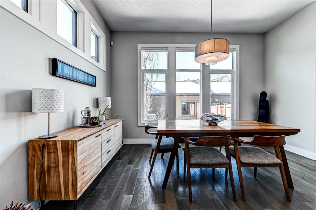 Spacious, very well-maintained semi-detached infill offering over 2,600 sq ft of beautifully developed living space in the heart of Currie Barracks — a true hidden gem. Ideally situated in The Commons of Currie, this home places green space, picturesque streetscapes, parks, and recreation just outside your door. Thoughtfully designed with a functional floor plan and quality upgrades throughout, it seamlessly blends comfort and style. The main floor impresses with 10-foot ceilings and a stunning raised living room anchored by a floor-to-ceiling tiled gas fireplace. Expansive windows fill the space with natural light, while the layout offers flexibility for multiple work-from-home setups. The modern kitchen showcases striking two-tone custom cabinetry with soft-close hardware, a built-in pantry, and a premium stainless steel appliance package — including a refrigerator, slide-in gas range, built-in hood fan, microwave, and dishwasher. A central island invites gathering, while a built-in desk provides the perfect homework station or additional workspace.