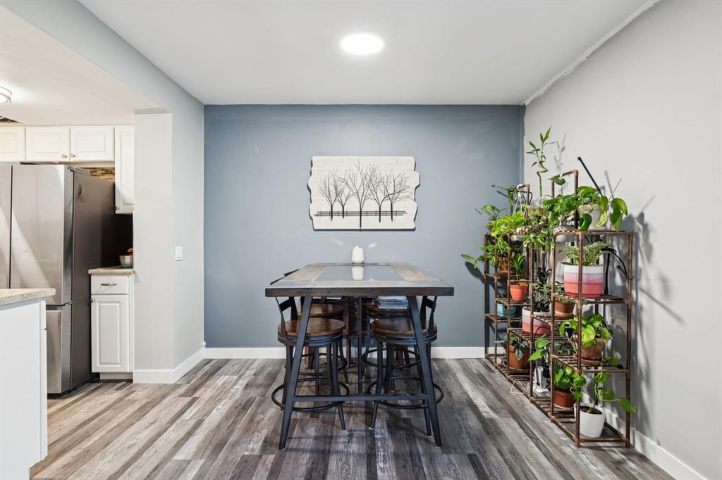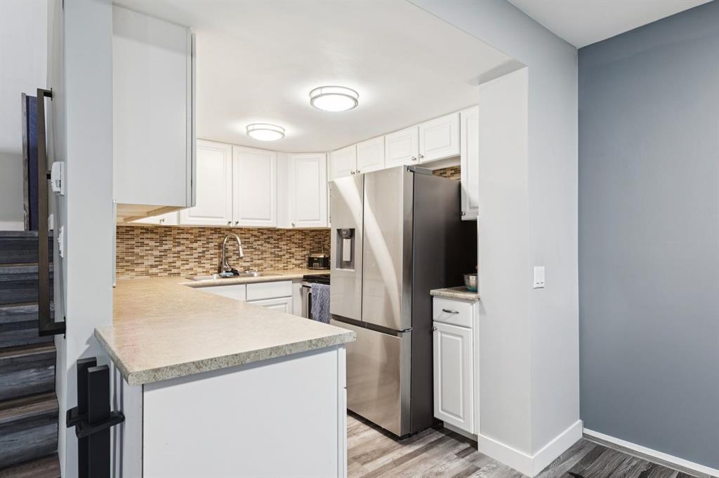 Unbeatable Location! Steps from the ridge, minutes to Fish Creek Park, and fantastic transit access. This lovely 3-bedroom condo features a open living/dining space with a cozy wood-burning fireplace and patio doors leading to a large, fully fenced private courtyard. The kitchen features white cabinetry, tiled backsplash, and stainless steel appliances. Upstairs offers three generous bedrooms and a spacious bath with double sinks. Beautiful Vinyl plank flooring throughout. Major updates in the complex include new windows, patio doors, front door, trim, fencing, large shed for additional storage, and durable Hardy Board exterior — the entire complex has undergone a full exterior overhaul.