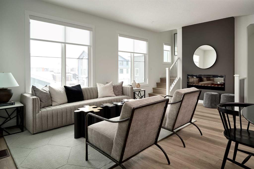 LIMITED TIME PROMOTION – Choose 2 of 3: | FREE A/C (SUPPLY & INSTALL) | 2 YEARS FREE CONDO FEES | $5,000 TOWARD WINDOW COVERINGS! The Armstrong by Brookfield Residential offers style, comfort, and convenience in the heart of Livingston. This brand-new, upgraded home features 3 bedrooms, 2.5 bathrooms, two private balconies, and a private double attached garage. The open-concept main level is ideal for entertaining, with a timeless kitchen showcasing full-height cabinets, quartz countertops, stainless-steel appliances including a chimney hood fan and built-in microwave + a spacious island for additional dining space. A bright living area with south-facing windows floods the space with natural light, while the dining area seamlessly connects to the kitchen. On the upper level, the ~11’x12’ primary retreat includes its own private balcony as well as a walk-in closet and ensuite with a walk-in shower. The upper level is completed by two additional bedrooms, a full bathroom, and laundry. Upgrades include A/C rough-in, a gas line for your BBQ on the main level balcony, and durable LVP flooring on the entry stairs. With nearly 1,200 ft² of living space (RMS: 1,170 / Builder: 1,255), this home is perfect for professionals, small families, or investors seeking a hassle-free property. Complete with full builder and Alberta New Home Warranty, this is your opportunity to enjoy the comfort and convenience of a brand-new home in one of Calgary’s most desirable new communities. Start enjoying the maintenance-free lifestyle this winter with no more snow shovelling!
