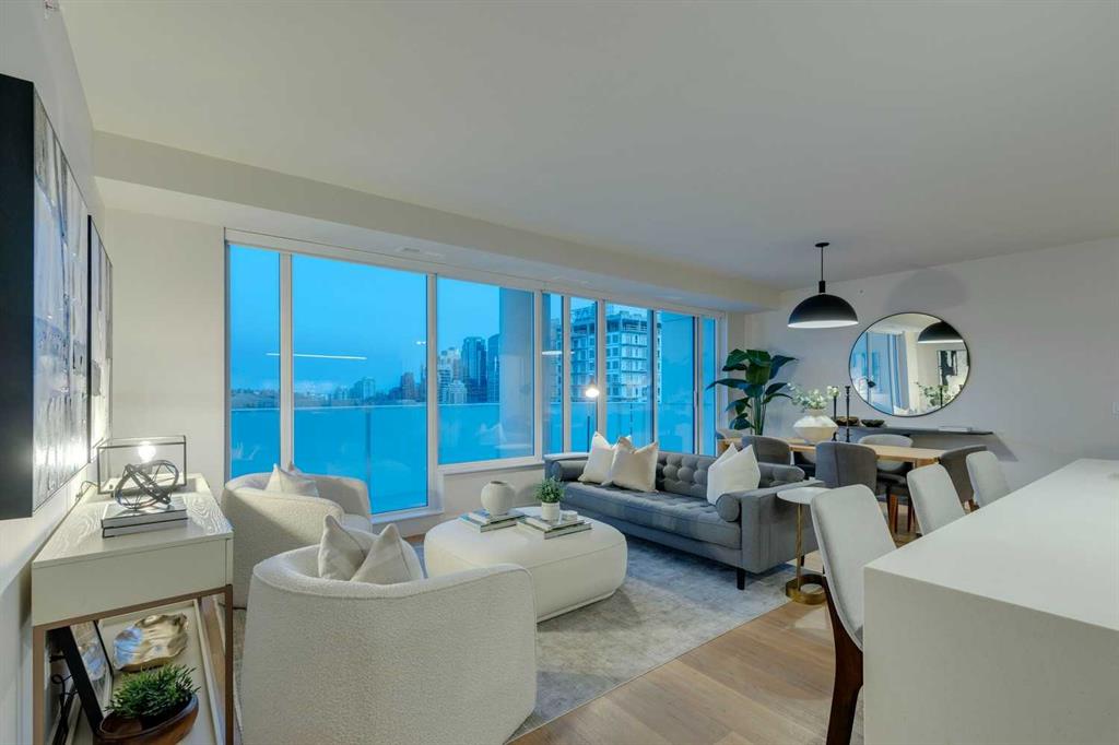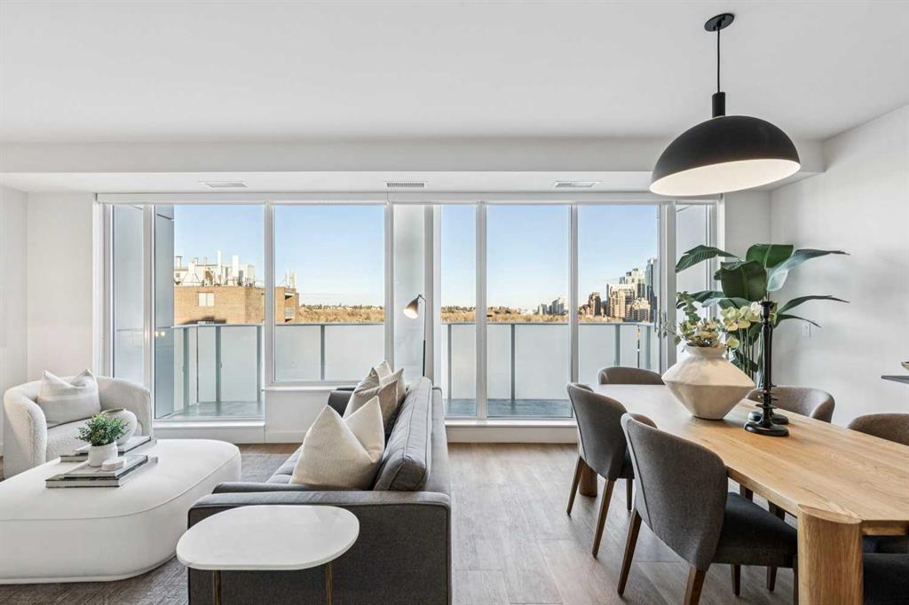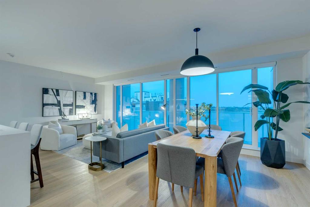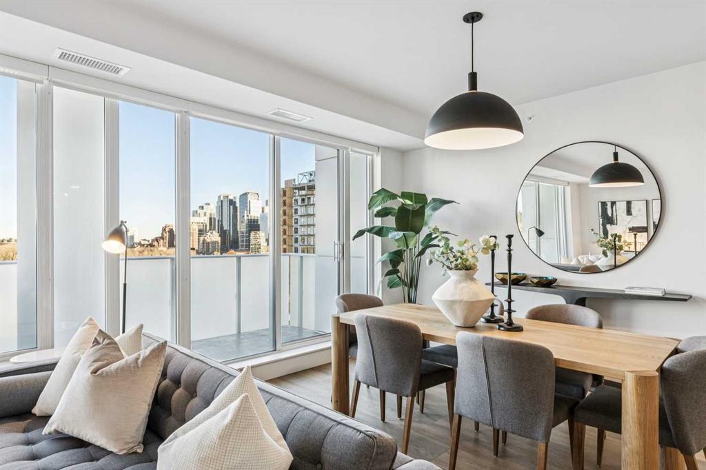 From the moment you enter, soaring 9-foot ceilings, expansive floor-to-ceiling windows, and elegant luxury vinyl plank flooring create a bright, airy atmosphere while framing captivating views of downtown Calgary skyline. The open-concept living and dining area flows effortlessly onto a spacious private balcony—an inviting retreat to relax or entertain while enjoying the glittering city backdrop and convenient natural gas BBQ hookup.