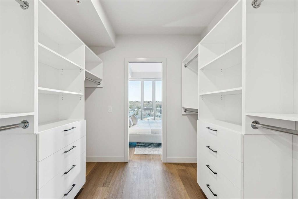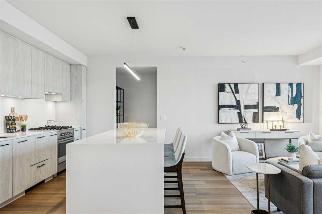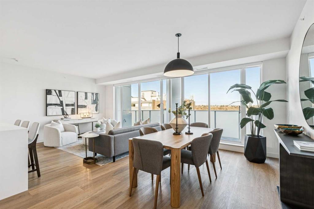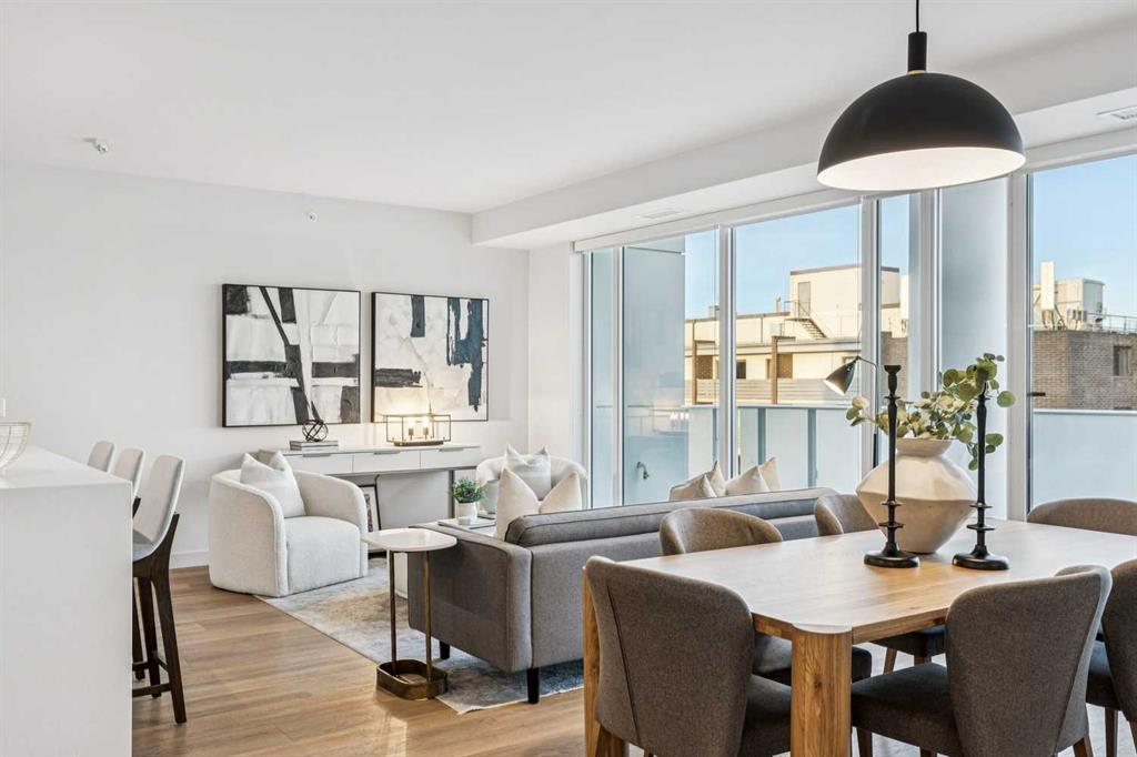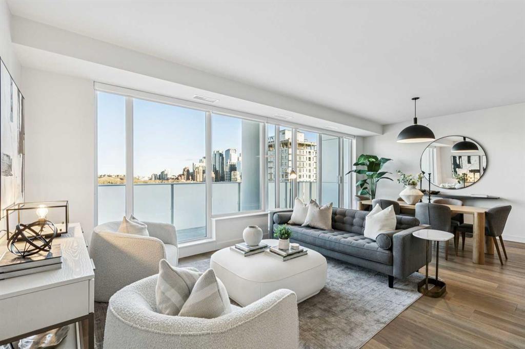 From the moment you enter, soaring 9-foot ceilings, expansive floor-to-ceiling windows, and elegant luxury vinyl plank flooring create a bright, airy atmosphere while framing captivating views of downtown Calgary skyline. The open-concept living and dining area flows effortlessly onto a spacious private balcony—an inviting retreat to relax or entertain while enjoying the glittering city backdrop and convenient natural gas BBQ hookup.