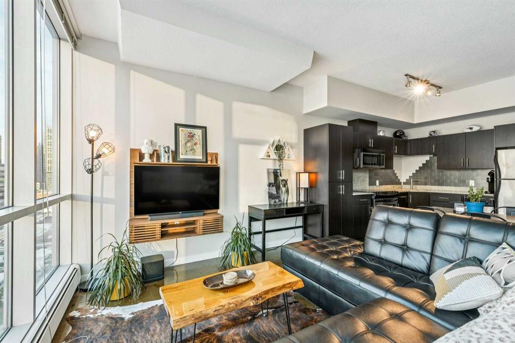 Wake up every day to postcard-worthy views of Calgary’s downtown skyline in the highly sought-after Colours building. This desirable two-bedroom floorplan showcases stunning floor-to-ceiling, north-facing windows that flood the space with natural light and frame incredible city views—an exceptional opportunity for buyers seeking both style and value. Upon entry, you’ll appreciate the polished concrete floors that add warmth and modern character throughout. The open-concept kitchen, dining and living areas offer seamless flow and flexible design possibilities for both everyday living and entertaining. The primary suite serves as a peaceful retreat with captivating downtown views, while the second bedroom easily adapts to your needs—whether as a guest room, work-from-home office, or creative studio. Step outside to your private balcony, complete with a natural gas hookup, perfect for evening barbecues and sunset lounging. Central air conditioning ensures year-round comfort, even on the hottest summer days. Residents of Colours enjoy communal bike storage, rentable private storage units, and a shared outdoor space. Downstairs, indulge in cocktails at the award-winning Proof, or pick up your favorite bottle from Vine Arts before settling in for a cozy night at home. You’re also just steps from First Street Market and acclaimed restaurants like Pat & Betty, Ten Foot Henry, and Calcutta Cricket Club. Enjoy walking access to the Stampede Grounds, the Scotiabank Saddledome, the upcoming Entertainment District, and everything the vibrant Beltline has to offer. Ideal for young professionals, first-time buyers, empty nesters, or investors, Colours is a short-term rental-friendly building—making this an exceptional lifestyle opportunity and a smart investment. This is downtown living at its finest!