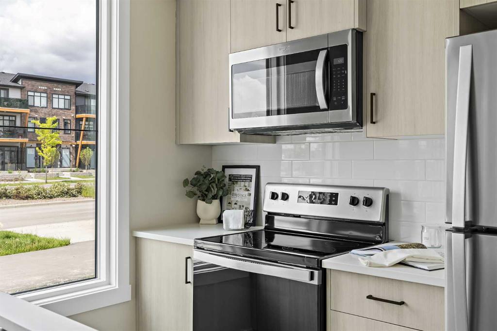 Introducing Meridian by Brookfield Residential, located in the heart of Livingston! This 1-bedroom, 1-bathroom townhome offers the perfect combination of convenience and comfort. CURRENT PROMOTION: Choose 2 OF 3 (your choice): (1) FREE A/C, (2) FREE condo fees for 2 years, or (3) $5,000 towards window coverings! This property includes a gas line to BBQ, Island Pendants, cabinet crown + riser and interior selections upgrades! Situated in a highly desirable neighbourhood, it’s just moments away from a wide range of amenities, making it an excellent choice for first-time homebuyers or investors. The ‘Coltrane’ model features a thoughtfully designed open-concept layout, complete with luxury vinyl plank flooring throughout the living spaces and bedroom (no carpet). The large west-facing windows at the front of the home invite abundant natural light, creating a bright and welcoming atmosphere all day long. The kitchen overlooks the living and dining areas, making it ideal for hosting friends and family. The kitchen is beautiful and functional, featuring stainless steel appliances, quartz countertops, full-height cabinets, and a pantry. The spacious peninsula island offers additional seating and storage options. The generous primary bedroom comes with a large closet and windows that look out onto the patio. A 4-piece bathroom and a utility room with in-suite laundry and extra storage complete the home, offering convenience and practicality. Completing the unit is a title parking stall. Situated in Livingston, a vibrant new community, this townhome is within walking distance of parks, playgrounds, the Livingston Homeowners Association, a dog park and numerous other amenities. With easy access to major routes, this property presents an opportunity that shouldn’t be missed. **Please note: The photos provided are of a previous home and may not represent the property for sale, finishes may vary.