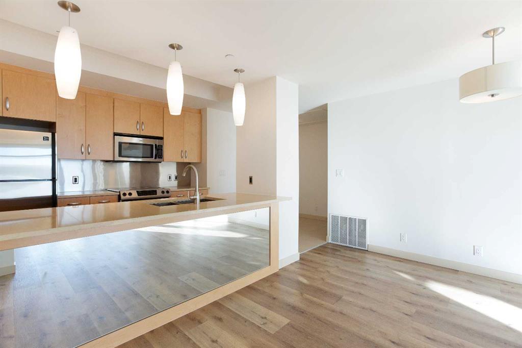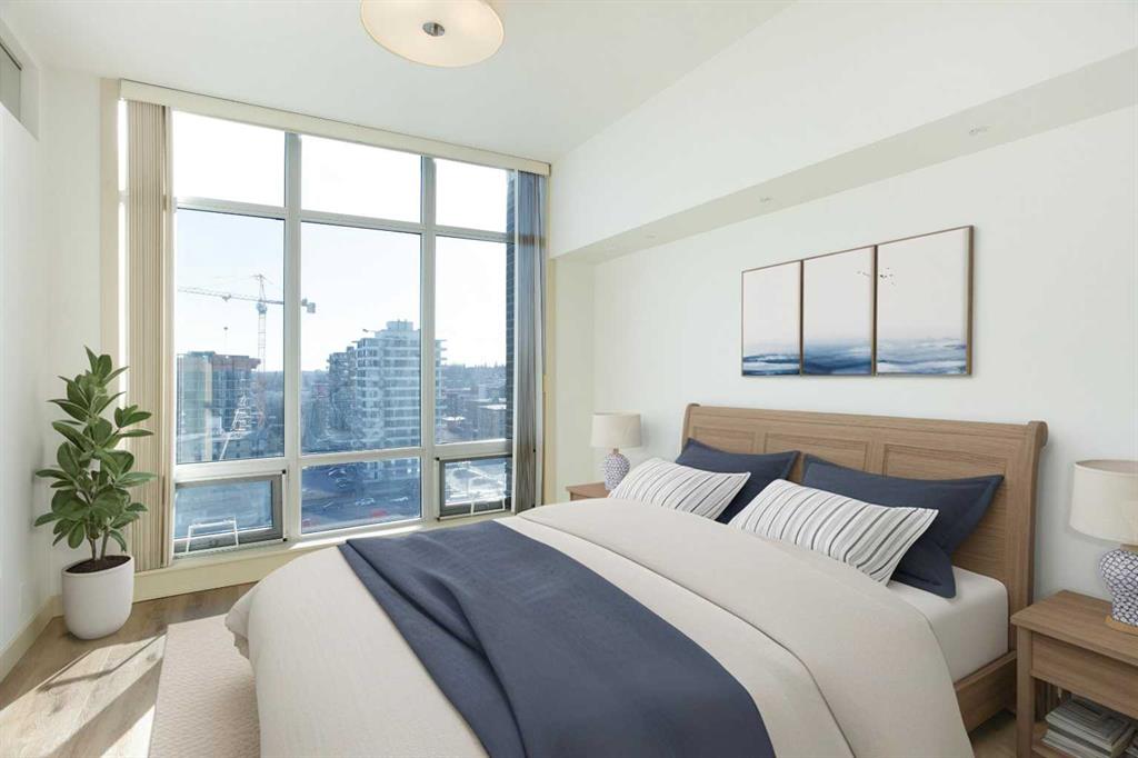 This stunning condo combines modern luxury with exceptional design, featuring brand-new flooring and fresh paint throughout. The open-concept floor plan showcases trendy wide plank flooring and a gorgeous kitchen equipped with quartz countertops, stainless steel appliances and a large breakfast bar perfect for entertaining. Floor-to-ceiling windows flood the space with natural light and offer unobstructed views. Step onto one of the largest and sunniest private balconies in the building to enjoy Calgary’s vibrant skyline.