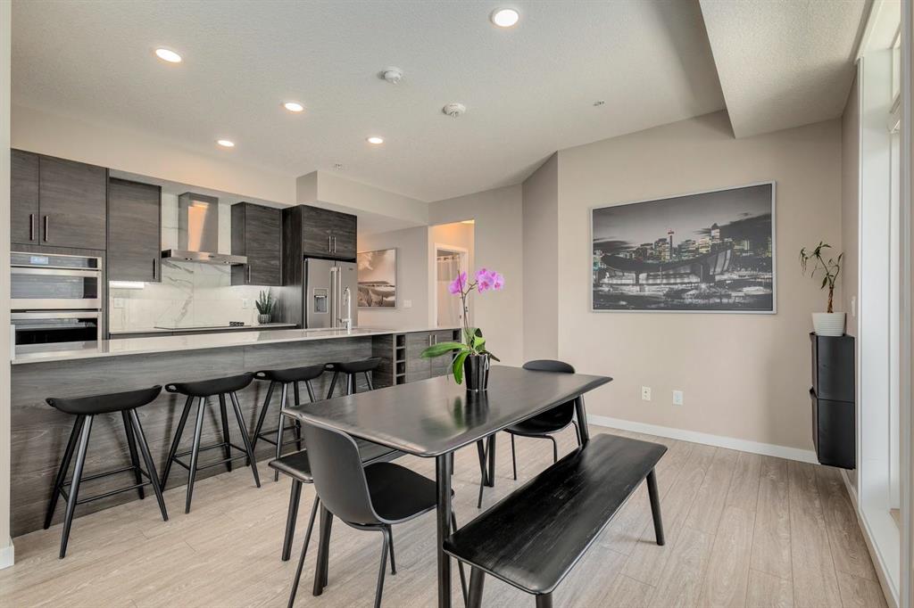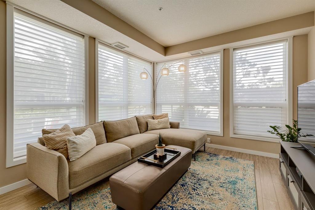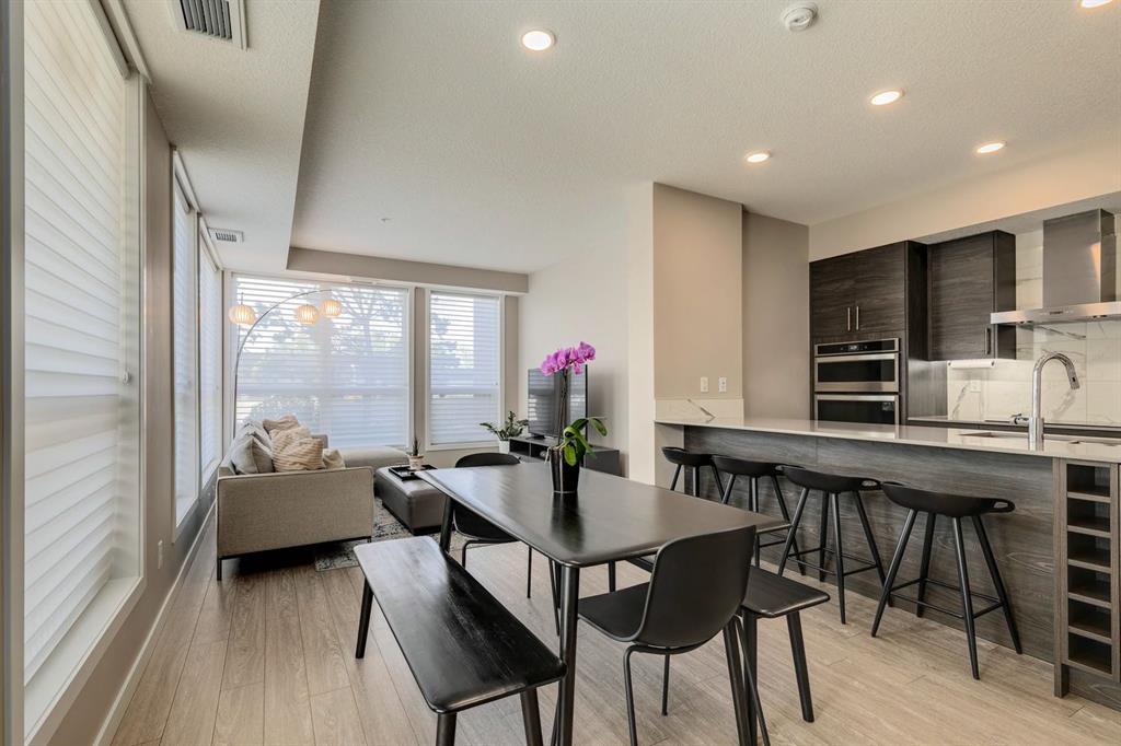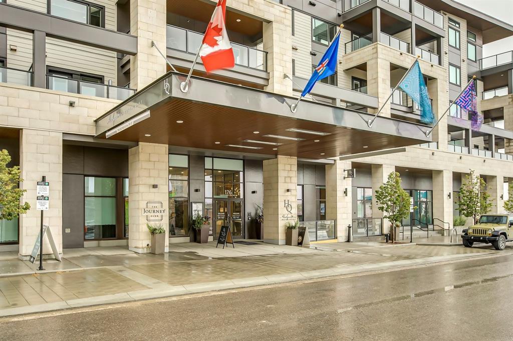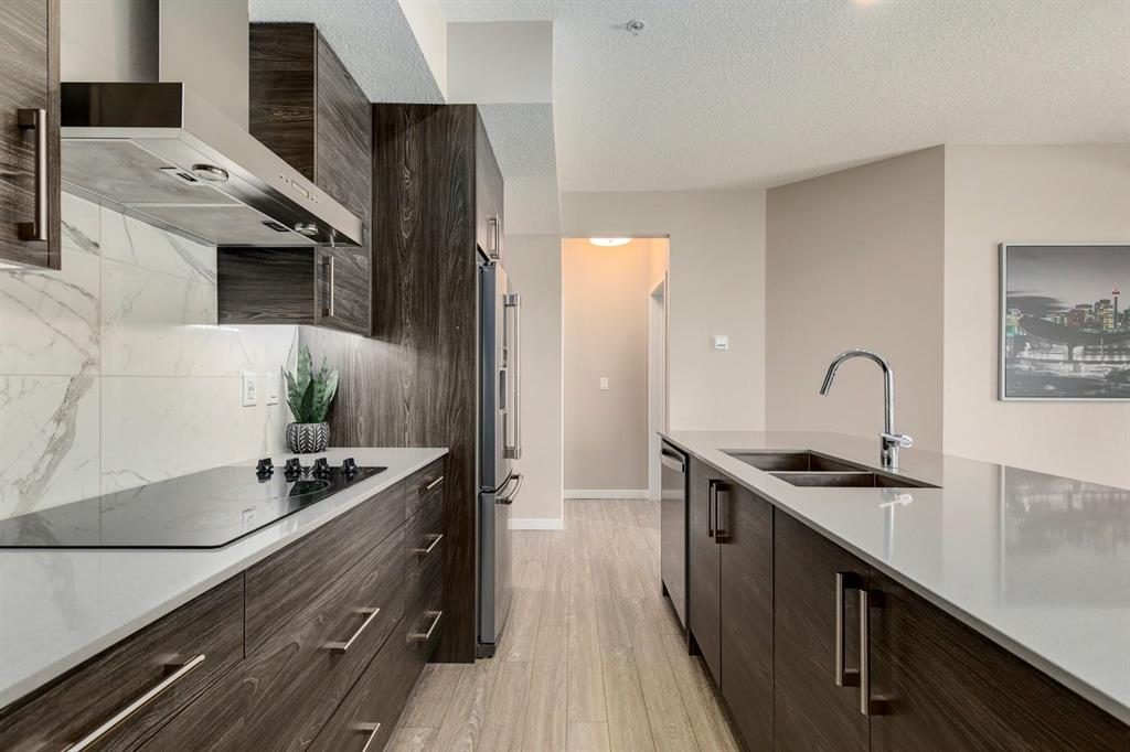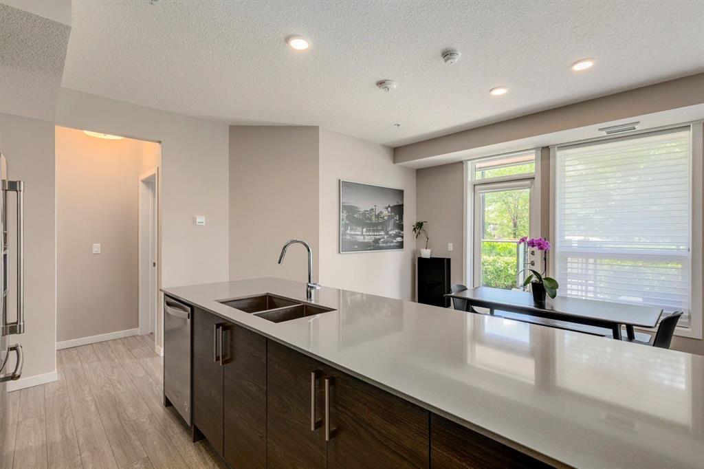 Lake Living in Mahogany is the dream but we kick it up a notch when living at Westman Village ~ Experience elevated, resort-style living in the heart of Westman Village with this beautifully appointed 2-bedroom, 2-bathroom main floor corner air conditioned unit. Perfectly positioned just steps from the adjacent West Beach and the Mahogany boardwalk, this rare offering blends luxury, comfort, and an unbeatable location within one of Calgary’s most amenity-rich lake communities. ~ Spanning 1040 sq ft, this air-conditioned home features 9-foot ceilings, wide-plank luxury vinyl flooring, and an abundance of natural light thanks to its corner-unit layout and additional windows throughout. The modern kitchen showcases sleek cabinetry, quartz countertops, and a stylish neutral colour palette that flows seamlessly into the bright and open living area.
