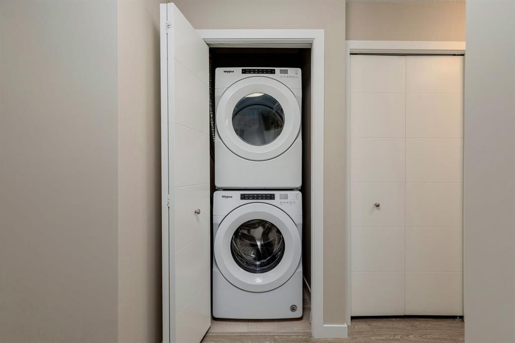 The oversized primary suite is a true retreat, featuring ample space for a sitting area or workspace, custom closets with built-in organizers, and a private 3-piece ensuite with modern fixtures and finishes. The spacious second bedroom includes a walk-in closet and a large window, with easy access to the second full 4-piece bathroom—ideal for guests or flexible use. Additional conveniences include in-suite laundry and a large in-suite storage room. AND you have a separate Storage Locker (rare) purchased from developer.