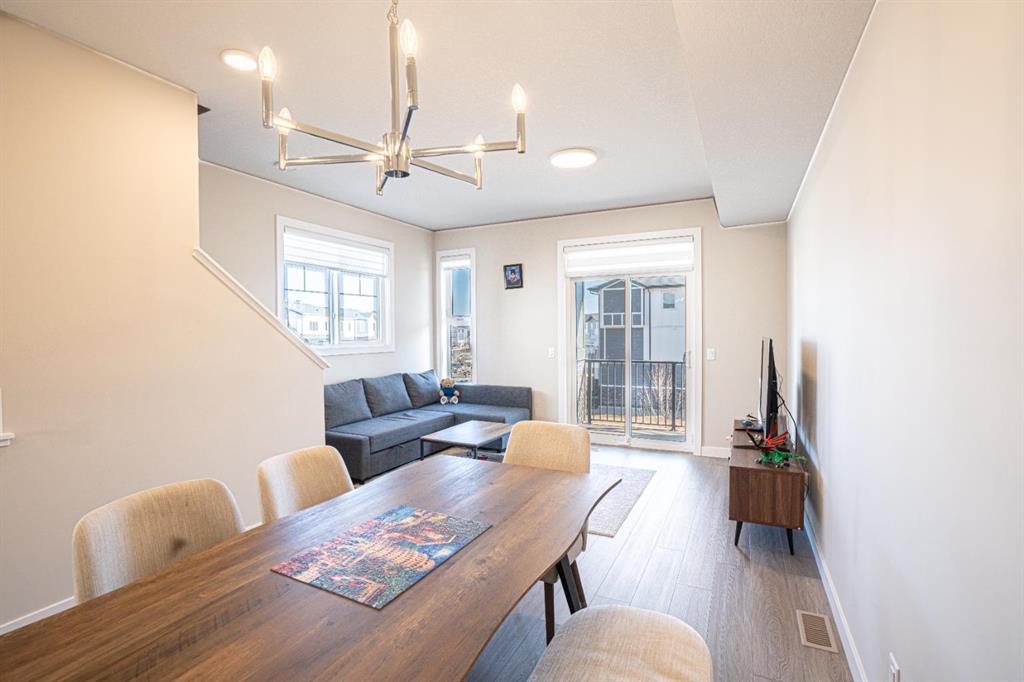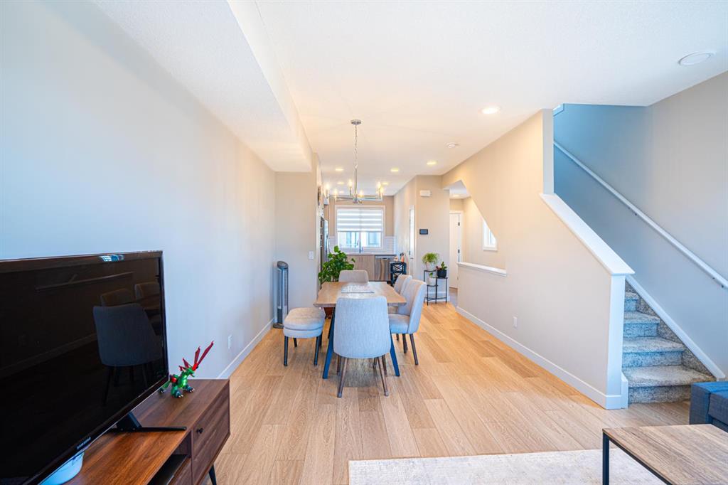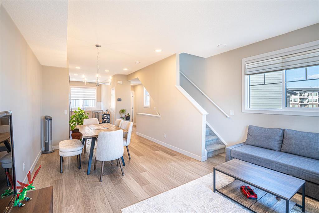 The main floor showcases a bright, open-concept layout where the kitchen, dining, and living areas flow effortlessly together—ideal for hosting or everyday living. Expansive windows bring in plenty of natural light, highlighting the home’s contemporary finishes and warm interior design.