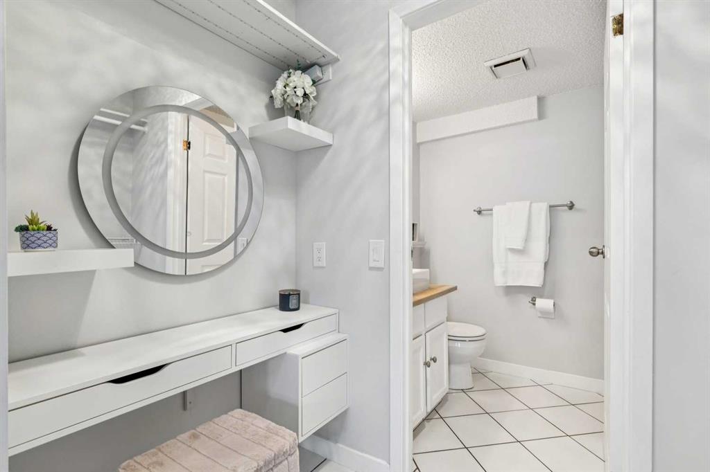 Inside, both bedrooms are generously sized with large windows, while the primary suite offers a walk-through closet with vanity and a private 2-piece ensuite. A well-appointed 4-piece main bathroom, in-unit stacked laundry, and closet organizers throughout add everyday convenience.