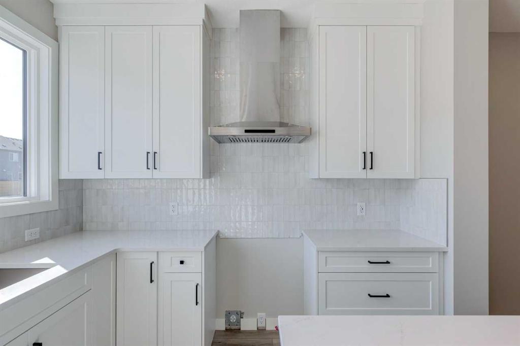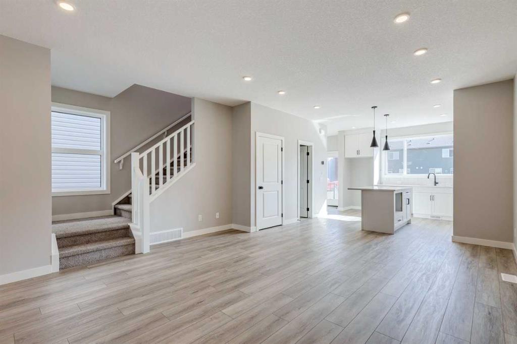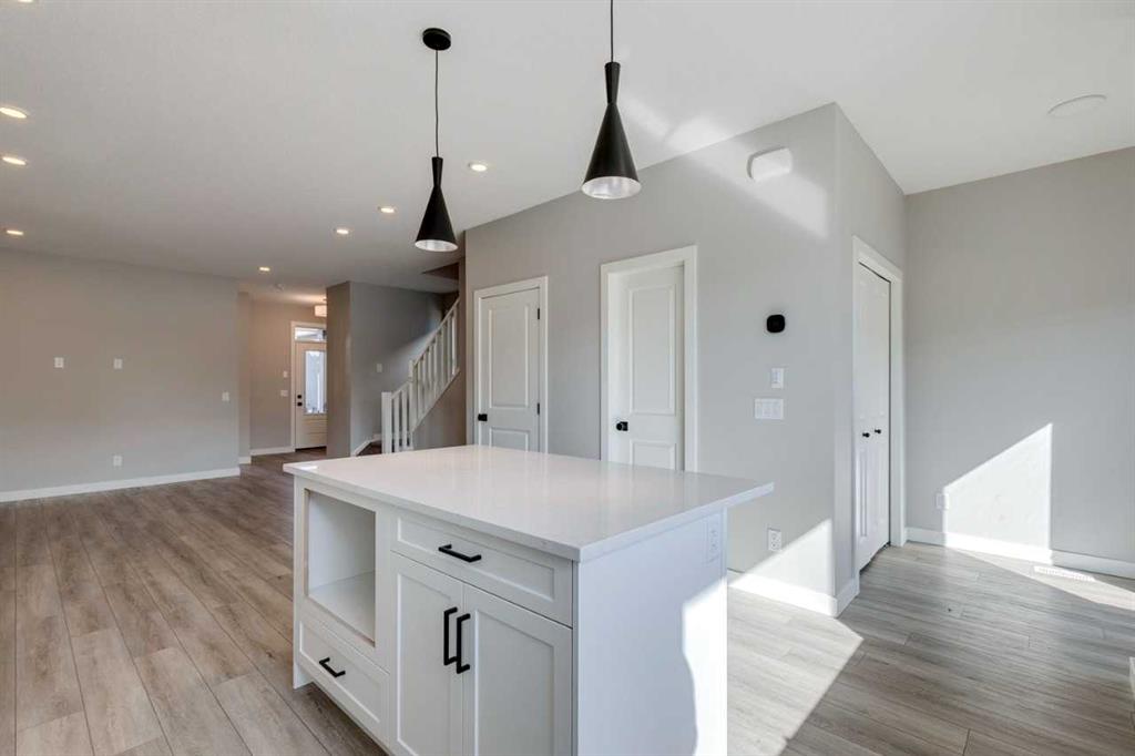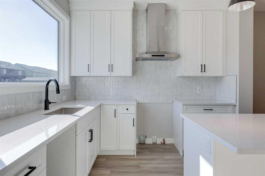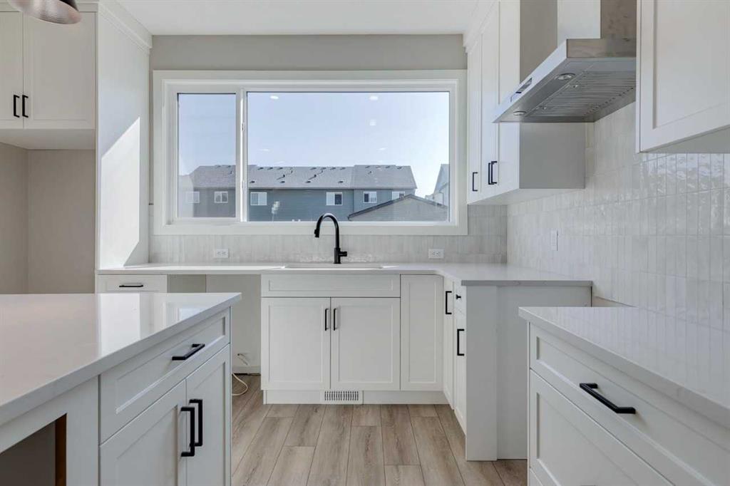 The Lucca by Cardel Homes, a Premium Paired home at 1,802 sq. ft. of well-designed living space. Its farmhouse-inspired exterior features Hardie board siding, black-framed windows, and a modern, open-concept layout. The interior boasts luxury vinyl plank flooring throughout the main floor, upper-floor loft, and hallway, creating a cohesive feel. The rear-facing kitchen overlooks the backyard and features Winter-stained maple cabinetry, quartz countertops, and Samsung stainless steel appliances. A chimney hood fan, large island, and picture window above the granite sink elevate both style and practicality. A functional back entry and walk-in pantry, ensures everyday convenience. At the front, a main-floor bedroom and full bath provide flexibility. Upstairs, the primary bedroom offers a dual-sink ensuite, while two additional bedrooms are separated by a loft space and a conveniently located laundry room. Photos are representative.