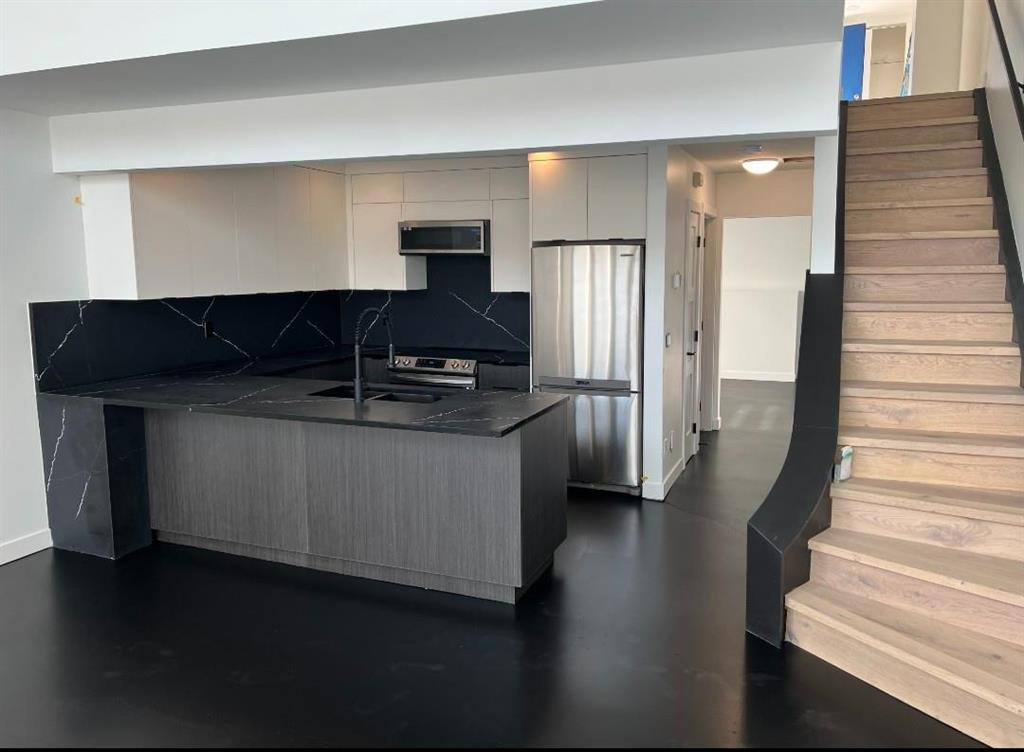 New York loft style inner city living with a view! Designed by award winning architect Jeremy Sturgess and situated in the vibrant community of Bankview, this updated, modern, loft style townhome has a lot to offer. Highlighted by dramatic architecture, soaring 2 story ceilings and stellar downtown views. Stunning main living area features 17′ floor to ceiling windows, chic concrete floors, oversized patio space plus and updated kitchen. 2 tone crisp white & wood grain cabinetry with upgraded stainless-steel appliances clad in marble-style quartz countertops completes the kitchen. 2 generous bedrooms each with their own lavish ensuite and located on their own level. Upper loft area makes an ideal flex space, home office or gym. Heated, secure underground parking with adjacent heated storage locker. Keep your car parked and walk to numerous eclectic dining, shopping and entertainment options. Minutes to off leash dog park and Sandy Beach park and pathways. Easy access to the downtown core and major road arteries.