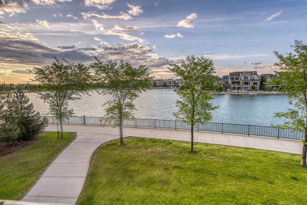 Welcome to an exceptionally rare lakefront residence in Westman Village, where intentional multi-level design elevates both privacy and livability. Perfectly positioned along the shores of Mahogany Lake, this sophisticated walkout home offers over 2,380 sq ft of thoughtfully separated living space, paired with an extraordinary 725 sq ft of covered outdoor balconies—all with uninterrupted lake views from both levels.