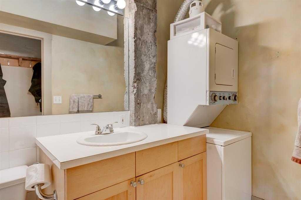 This fabulous loft-style condo in desirable Glamorgan comes complete with a funky 10’ Swing! This corner unit has 12’ Ceilings and a wall of atrium windows overlooking your private patio and providing great natural light. Open concept living with built-in MURPHY BED, shelving and desk along with a LOFT, currently being used as a Bedroom. This space provides lots of room for storage, alternatively. Loft area is included in great size. Wood Plank flooring throughout with Ceramic Tile in the 4pc Bathroom. Maple cabinetry in the Kitchen with Stainless Steel Counter tops, Appliances and a movable Island. The 4pc bathroom includes a Soaker Tub, a large Vanity and houses in suite Laundry. Concrete stairs access the large, private Patio. Tiered gardening along with trees & shrubs with a chain link fence, offering great privacy and outdoor living space. A private Gate allows for exterior access. Parking stall is located right outside the unit along with visitor parking. This is one of the best locations in this small complex. The low condo fee of includes heat & water. Great proximity to Mount Royal University, shopping, restaurants & pubs. Minutes to Westhills Shopping Centre, Glenmore Park and easy access to Stoney Trail.
