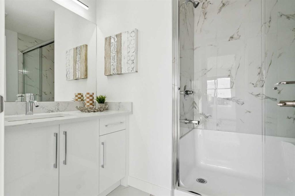 LOW CONDO FEES | MOVE-IN READY | 4 BED 4 BATH UNIT | MAIN-FLOOR PRIVATE GUEST SUITE | TOTAL 1,838 SQ FT | Welcome to Unit 102 at Saddlecrest Living, a 4-bedroom plus den, 4-full-bath home in a brand-new 43-townhome community redefining suburban living in Calgary’s Northeast. This home is spread across three levels with an attached garage, offering both space and flexibility for families. A key feature is the main-floor guest suite with a full bath and private rear entry, perfect for parents, older kids, extended family, or guests, and it also provides potential for future rental income. The main floor features an open layout with 9-foot ceilings and triple-pane windows, filling the home with natural light and improving energy efficiency. The kitchen includes floor-to-ceiling cabinetry and premium quartz countertops, creating a modern, high-end finish. Upstairs, the primary bedroom includes a custom shower with a built-in seat, and each bathroom is finished with full-height tile for a clean, modern look. Carpeted bedrooms add comfort, while luxury vinyl plank flooring on the main level ensures durability and easy maintenance. Built for Calgary’s weather, the exterior combines stucco and Hardie siding for hail protection and low maintenance. At Saddlecrest Living, you are part of a connected community close to schools, playgrounds, Saddletowne LRT, shopping, clinics, and fitness centres, with quick access to Stoney Trail, the airport, Costco, CrossIron Mills, and New Horizon Mall. MOVE IN WITH EASE. CONDO FEES ARE WAIVED FOR THE FIRST YEAR, so you can settle into Saddlecrest Living without added costs. Whether this is your first home, your next step as a growing family, or a smart investment, Unit 102 delivers space, versatility, and community in one of Calgary’s most dynamic corridors. Come experience this beautifully finished home in person. Visit the neighbouring showhome (A2265177) for a full tour of the layout and finishes (images are for illustration purposes). Units in this building are available for purchase individually or as a full package.