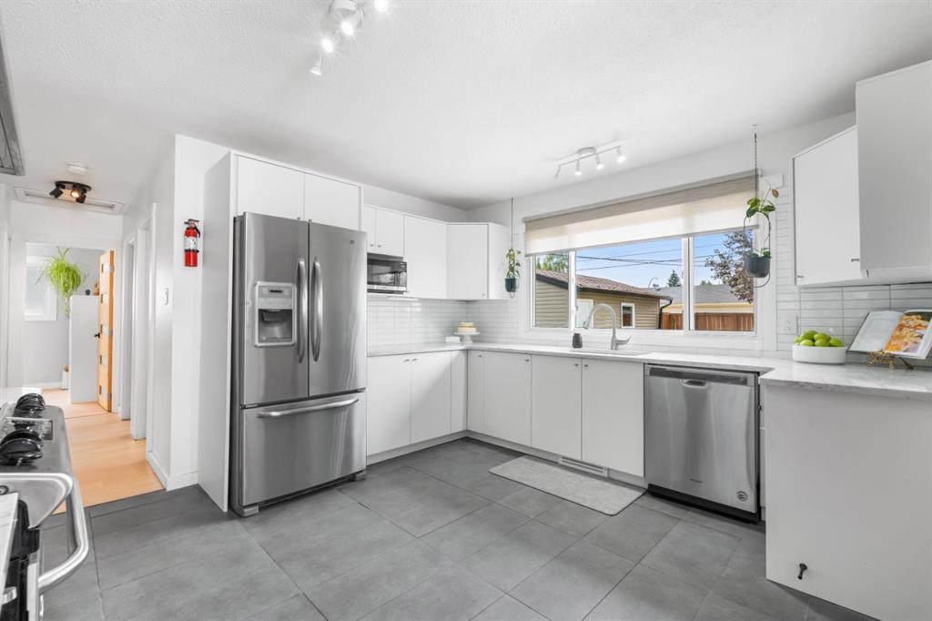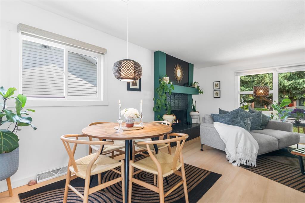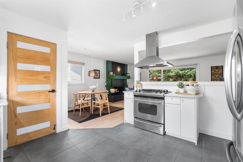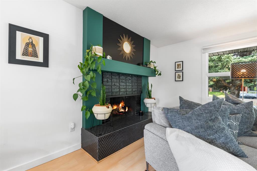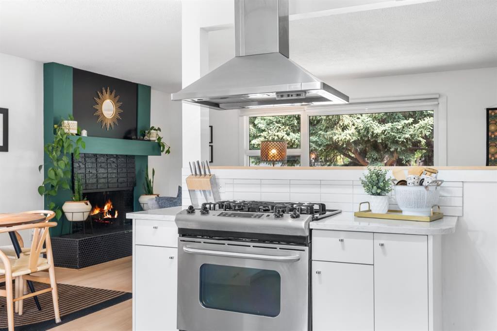 Sunlight dances across an inviting main floor, where a warm, wood-burning fireplace sets the tone. The airy dining space flows into a stunningly renewed kitchen with refaced cabinetry, statement tile, stone countertops, stainless steel appliances, and designer lighting – the perfect stage for morning coffee or lively gatherings.