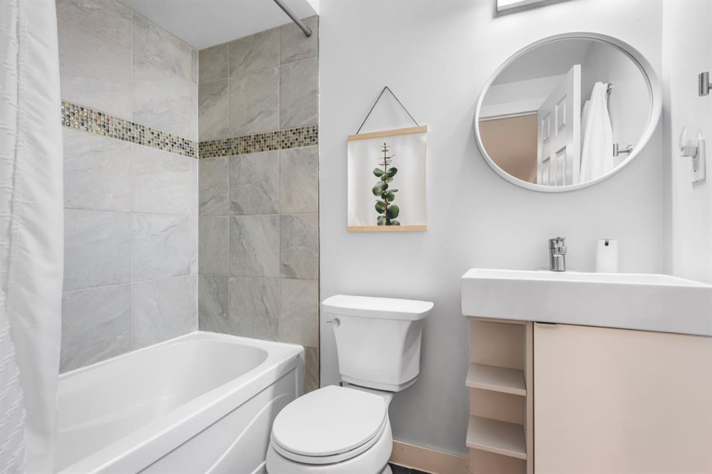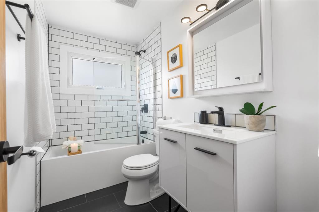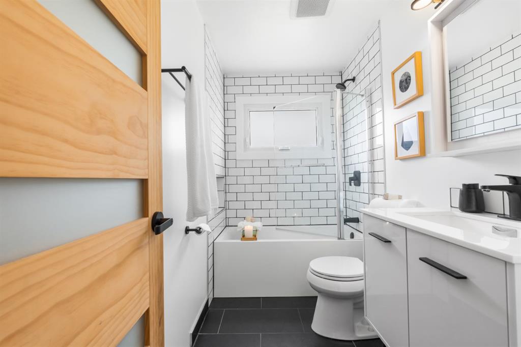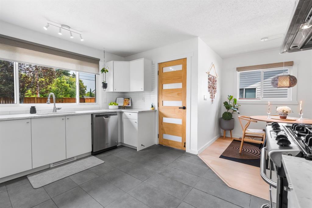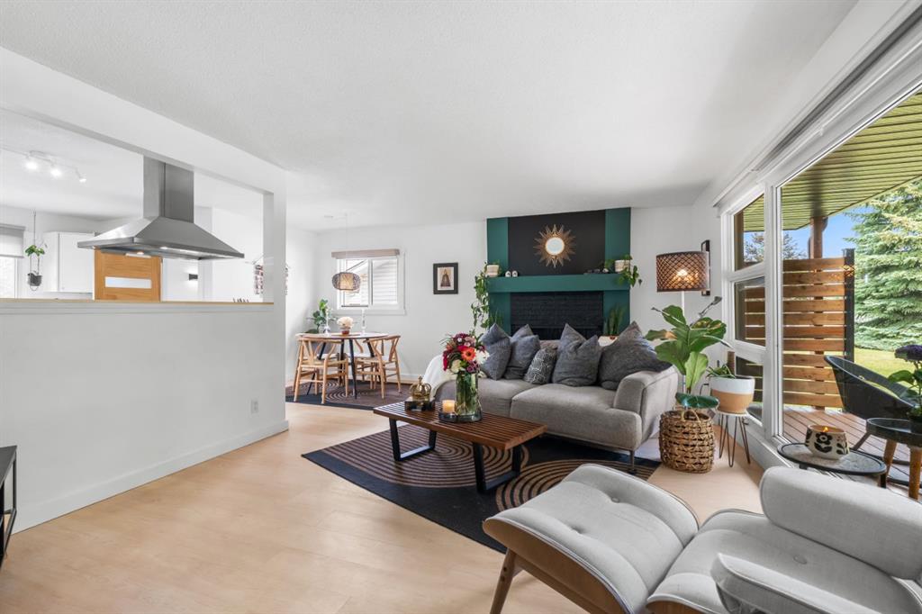 Sunlight dances across an inviting main floor, where a warm, wood-burning fireplace sets the tone. The airy dining space flows into a stunningly renewed kitchen with refaced cabinetry, statement tile, stone countertops, stainless steel appliances, and designer lighting – the perfect stage for morning coffee or lively gatherings.