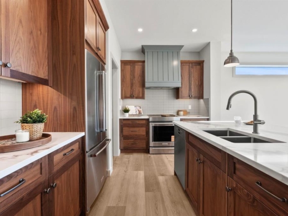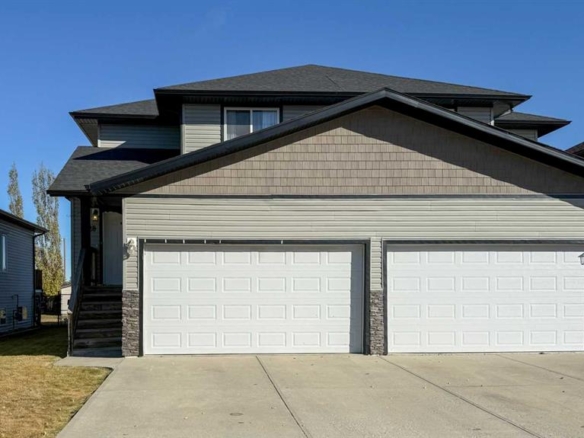 This spotless home was built by a local reputable builder (Anchored Custom Homes) and it backs the Nature Space in Carstairs. It has many added features such as extra windows, special trim, oversized island, wood shelves and much more that is evident when you walk through. The front entry is spacious with its full height ceiling. Go next Into the great room which has vaulted ceilings and vinyl plank flooring. The generous sized living room has a gas fireplace with windows on each side and a brick feature wall. The bright white kitchen has a large island with quartz counters and lots of counter space and cabinets. The microwave is tucked under the counter and the pantry is a walk thru one with wood shelves. The dining room is large enough for a big table and has a big window which faces the back yard and the view of the park/nature space WITHOUT ANY NEIGHBORS BEHIND. The door from the dining area leads to the covered back deck and the partially fenced yard. There is an area with gravel that is ready for a patio level. Back inside on the main floor is the powder room with quartz counter, a laundry room and the entry to the garage. The 23×24 ft garage is insulated, drywalled and painted and has an infrared heater. It easily fits 2 vehicles. Upstairs you will find a large primary bedroom with ensuite which has double vanities and a separate shower as well as soaker tub. The walk in closet is large. There are 2 more bedrooms on this level with nice windows and great closets. The main bathroom is large. The basement is ready for your development ideas with large windows and 9 ft ceilings. There is an alley on the west side of the house which makes RV parking easy. Make an appointment today to see this special home. You will not be disappointed.