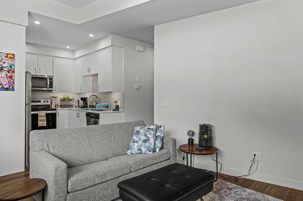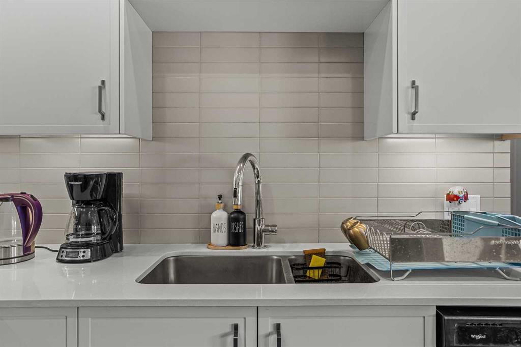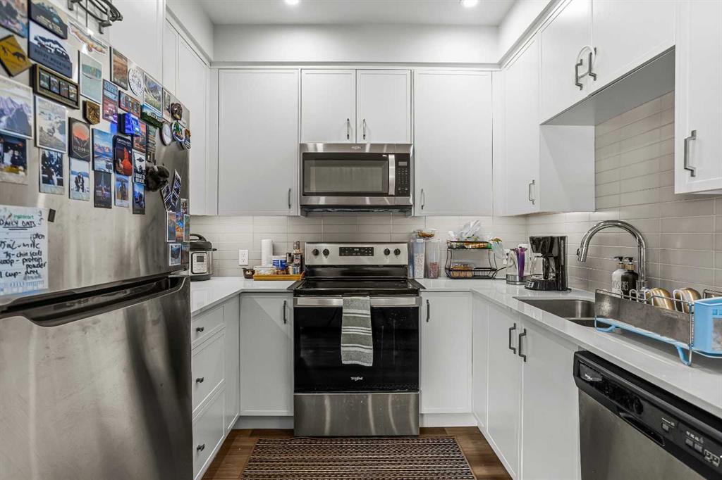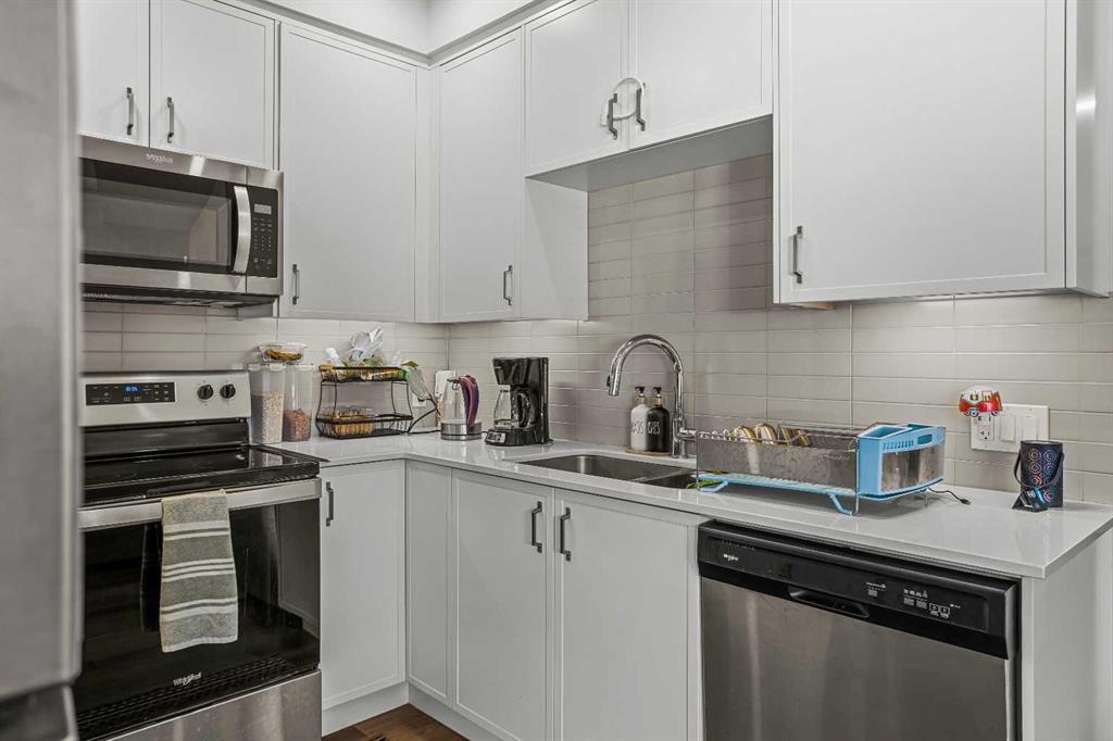 The modern kitchen offers clean contemporary finishes including quartz countertops, stainless steel appliances, full-height cabinetry, and a stylish tile backsplash. Its efficient design provides excellent storage and workspace while maintaining an open connection to the living area—ideal for both everyday living and entertaining.