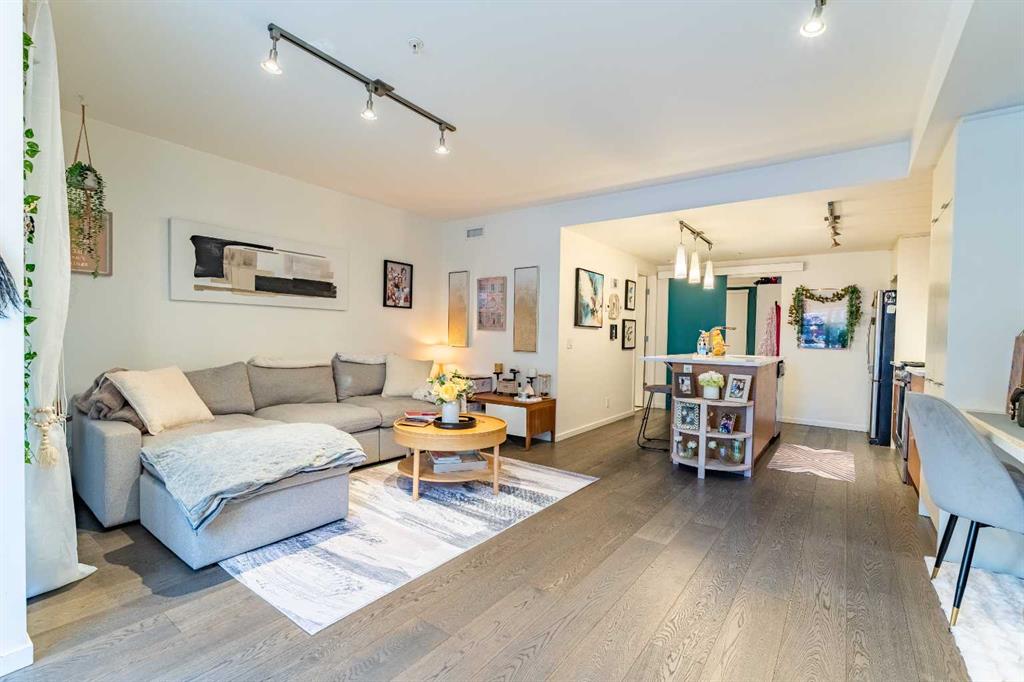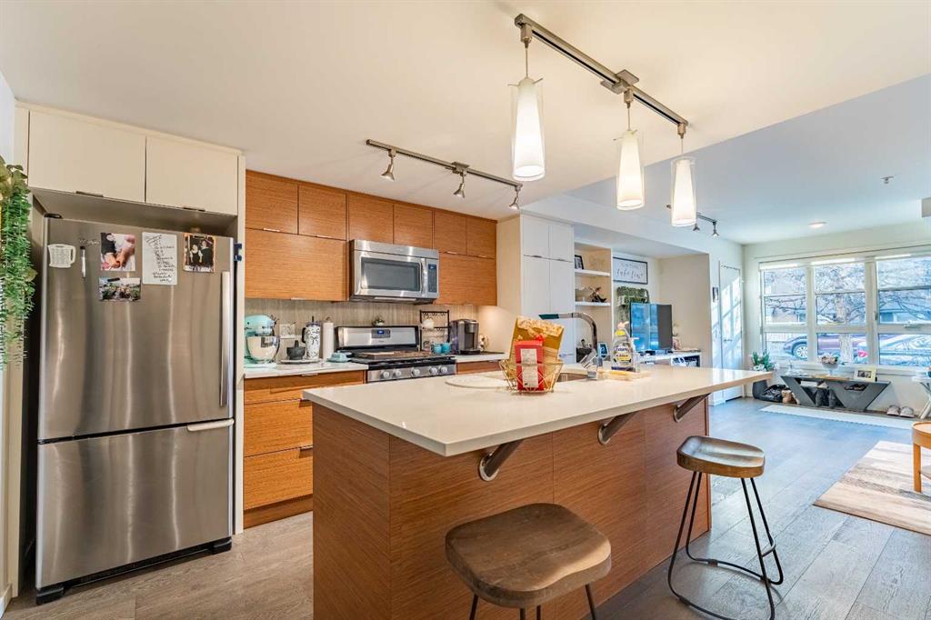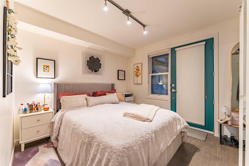 Welcome to The Block, featuring some of the most desirable walkout brownstone-style one-bedroom units in the building—rarely available. Located on a quiet street just off 17th Avenue, this pet-friendly condo offers the ideal balance of inner-city convenience and peaceful living. The bright, open-concept layout is filled with natural morning sunlight and features hardwood flooring throughout (no carpet), flat ceilings, upgraded pendant lighting, custom built-in millwork shelving, a 10mm glass shower door, and a recently upgraded LG washer and dryer. In-floor heating provides year-round comfort with no furnace or hot water tank to maintain.