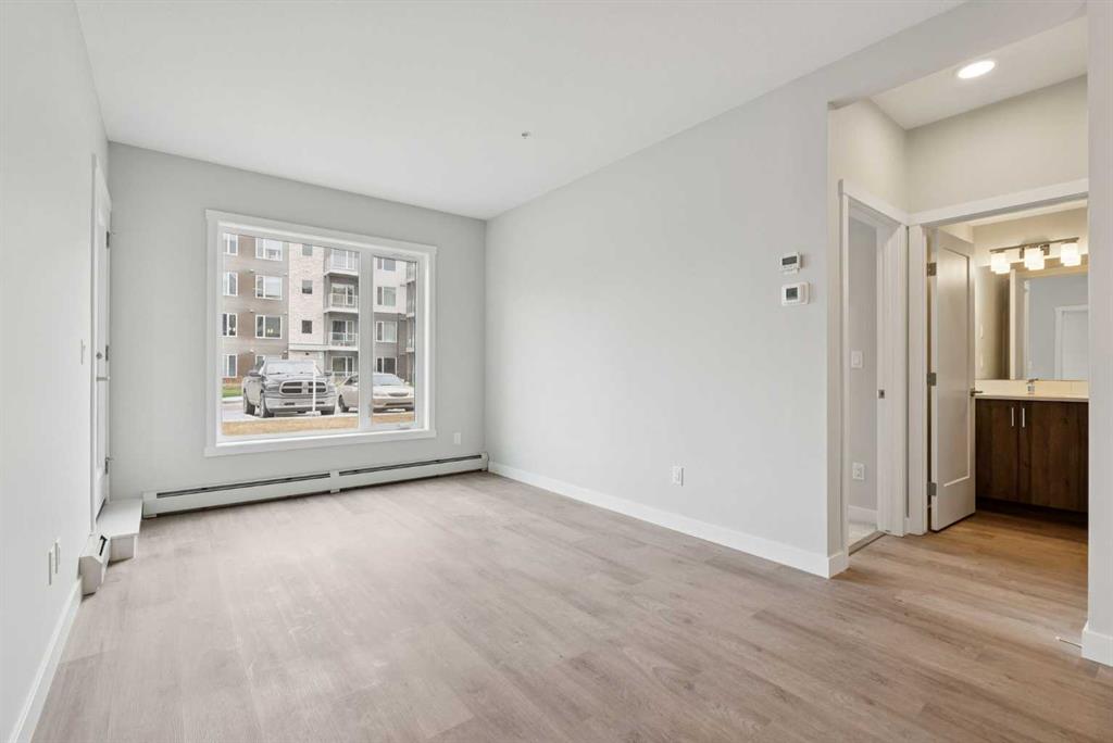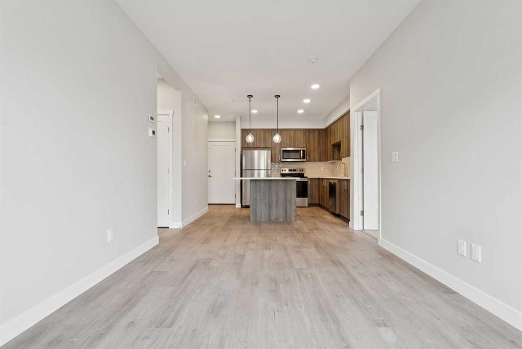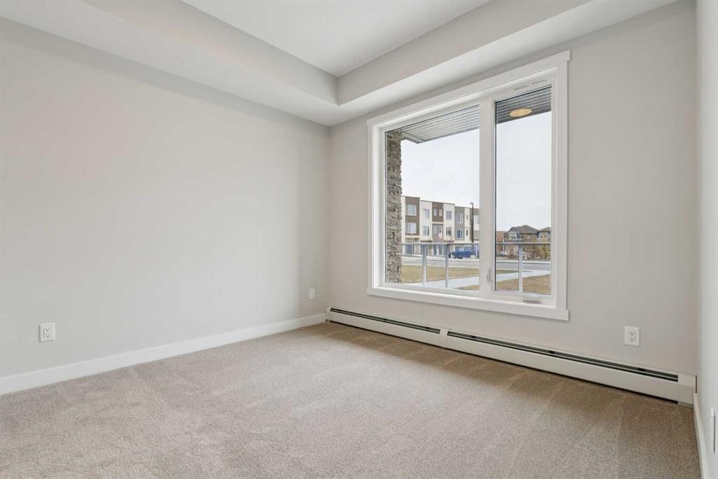 Welcome to this beautifully designed, brand-new, never-lived-in 2-bedroom plus den condo in sought-after Shawnee Slopes, offering modern comfort, stylish finishes, and immediate possession. Perfectly positioned on the main floor, this home features a private patio—ideal for easy access, pet owners, or enjoying seamless indoor-outdoor living. Inside, the open-concept layout is thoughtfully finished with luxury vinyl plank flooring throughout the main living areas and soft carpet in the bedrooms. The contemporary kitchen is both functional and elegant, complete with quartz countertops, stainless steel appliances, and a central island with breakfast bar seating, making it perfect for everyday living and entertaining. The bright and spacious living area is filled with natural light and flows effortlessly to the patio, creating a warm and inviting atmosphere. The primary bedroom showcases provides a peaceful outlook, while the second bedroom and versatile den offer flexible space for guests, a home office, or additional living needs. A well-appointed full bathroom with quartz counters and a tub/shower combination, along with convenient in-suite laundry, adds to the home’s overall functionality. Additional highlights include titled underground parking, titled storage, visitor parking, and a pet-friendly building. Enjoy low monthly condo fees of $376.79, which include heat, water, sewer, garbage and recycling, exterior maintenance, reserve fund contributions, snow removal, underground parkade maintenance, and professional management. Ideally located just minutes from Fish Creek Provincial Park, LRT access, Macleod Trail, and the shopping, dining, and everyday amenities of Shawnessy, this home offers the perfect blend of nature, convenience, and modern condo living.