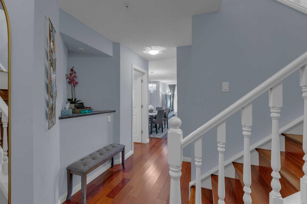 The main level features rich hardwood flooring, a spacious living area with a cozy gas fireplace, and a well-appointed kitchen showcasing granite countertops and stainless steel appliances. A convenient two-piece powder room completes this level.