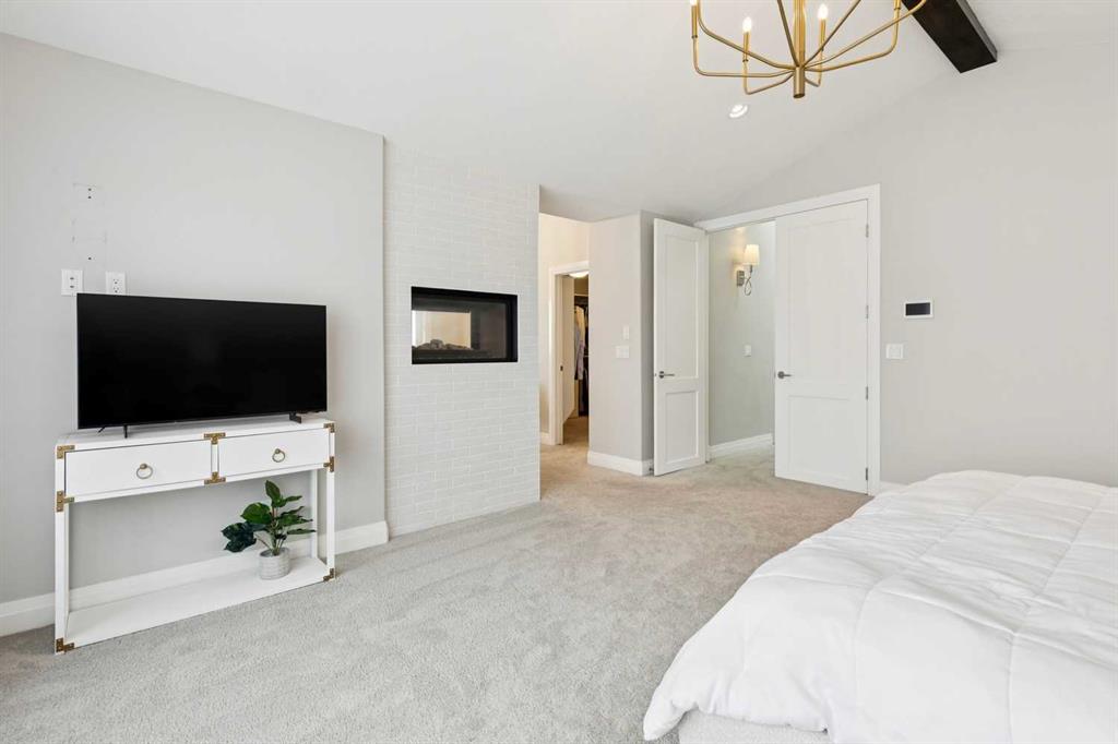 Upstairs, soaring ceilings and skylights continue the sense of openness. The primary retreat is expansive, featuring vaulted ceilings, large west-facing windows, and an additional double-sided gas fireplace that adds warmth and character. A private lounge area with built-in bar creates separation within the suite, offering both scale and privacy. The spa-like ensuite includes heated floors, a freestanding soaker tub, and a beautifully designed oversized shower that feels more like a private retreat than a typical bathroom. The generous walk-in closet offers extensive custom storage and connects directly to the laundry room for everyday convenience.