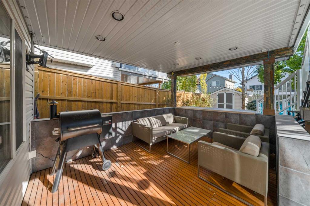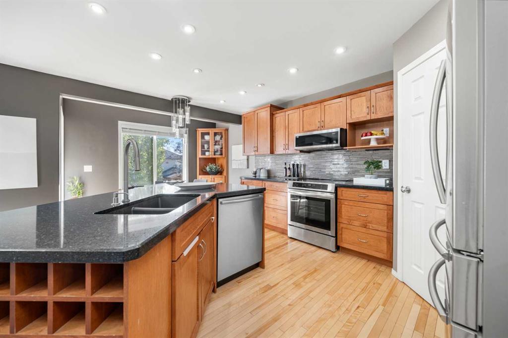 IMPECCABLY MAINTAINED and EXTENSIVELY UPGRADED, this exceptional WALKOUT HOME stands head and shoulders above others in BRIDLEWOOD, combining a functional family layout with outdoor spaces designed for entertaining. A welcoming OPEN-TO-ABOVE FOYER creates a sense of volume and privacy as you step inside. The main level flows seamlessly through the LIVING ROOM, DINING AREA, and CHEF’S KITCHEN, where extended WOOD CABINETRY, QUARTZ COUNTERTOPS, a GRANITE SIL SINK, and STAINLESS STEEL APPLIANCES with an INDUCTION STOVE set the stage for everyday cooking and weekend gatherings. A CORNER PANTRY with upgraded shelving provides practical storage, while a GARBAGE PULLOUT and HUTCH enhance function. The inviting LIVING ROOM centers around a GAS FIREPLACE with a built-in BLOWER FAN for cozy ambiance and added warmth. The main floor is completed by a well-designed MUDROOM with LAUNDRY on PEDESTALS, generous storage, and a stylish 2-PIECE POWDER ROOM. Upstairs, the thoughtful family layout continues with three bedrooms, including a bright BONUS ROOM converted to a bedroom, complete with an ELECTRIC FIREPLACE, WOOD CLOSET ORGANIZER, and included TV beneath CATHEDRAL CEILINGS. The 4-PIECE MAIN BATHROOM features EPOXY COUNTERS and WATERPROOF LAMINATE FLOORING for easy care. The PRIMARY SUITE is a true retreat with a WALK-IN CLOSET by CALIFORNIA CLOSETS and a beautifully updated 4-PIECE ENSUITE with matching finishes. The FULLY FINISHED WALKOUT BASEMENT expands the living space with CORK FLOORING laid over a SUBFLOOR for warmth, OVERSIZED WINDOWS that fill the space with light, and a STONE FEATURE WALL prewired for 9.2 SURROUND SOUND. This level includes a RECREATION ROOM, 4TH BEDROOM, 3-PIECE BATHROOM with STAND-UP SHOWER, and excellent STORAGE. Walls and ceilings are sound-dampened with ROXUL SAFE AND SOUND INSULATION, creating an ideal environment for movie nights or guests. Outside, the landscaped yard becomes an ENTERTAINER’S PARADISE with MATURE TREES, raised FLOWER BEDS, a wide DURADEK UPPER DECK with stairs to the ground, and a COVERED SEATING AREA below featuring an EATING BAR, TV MOUNT, and WIRING FOR 5.1 SURROUND SOUND. The lower patio and GEMSTONE LIGHTING on the front, back, and under the deck—complete with multi-color holiday and mood options—create a stunning evening atmosphere. Every upgrade was thoughtfully chosen and fully permitted, including FLAT-PAINTED CEILINGS, upgraded HAIL-RESISTANT SHINGLES (2022) with enhanced ventilation, LED LIGHTING throughout, HOT WATER ON DEMAND, CENTRAL AIR CONDITIONING, a WATER SOFTENER, and a HIGH-EFFICIENCY FURNACE. The insulated DOUBLE ATTACHED GARAGE is finished with 5-LB FOAM INSULATION, EPOXY FLOORS, GAS HEATER, POT LIGHTS, and an ULTRA-QUIET OPENER, while a widened driveway provides additional parking. This home perfectly combines family function with luxurious comfort—ideal for those who love to gather, entertain, and enjoy every space inside and out.