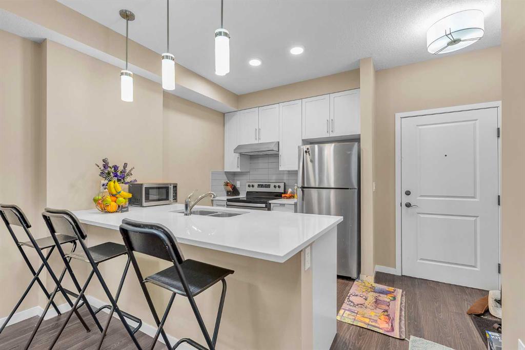 Welcome to Sandgate at Mahogany Lake! Located in one of Calgary’s most vibrant and sought-after lake communities, this beautifully maintained unit offers the perfect blend of style and functionality. With over 500 sq ft of thoughtfully designed living space, this 1-bedroom, 1-bathroom condo includes a titled parking stall for your convenience. Step inside to discover laminate flooring throughout and a bright, open-concept layout. The contemporary kitchen features sleek white cabinetry, quartz countertops, stainless steel appliances, and a central island with a breakfast bar, ideal for both everyday living and entertaining. A door from the spacious living leads to a generous outdoor patio, perfect for enjoying warm summer days. The well-sized bedroom features a large walk-through closet that connects to a 4-piece ensuite, and in-suite laundry adds extra convenience. Sandgate offers fantastic amenities including a full fitness centre, and as a resident of Mahogany, you’ll enjoy year-round access to the lake -perfect for swimming, skating, fishing, or simply relaxing by the water. Ideally situated close to schools, parks, playgrounds, shopping, dining, and public transit, this home is perfect for first-time buyers, downsizers, or investors alike. Don’t miss this opportunity to enjoy lakeside living in one of Calgary’s premier neighbourhoods – schedule your private showing today!
