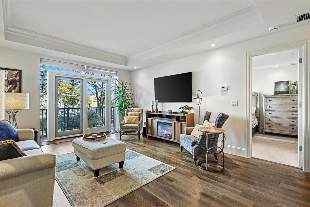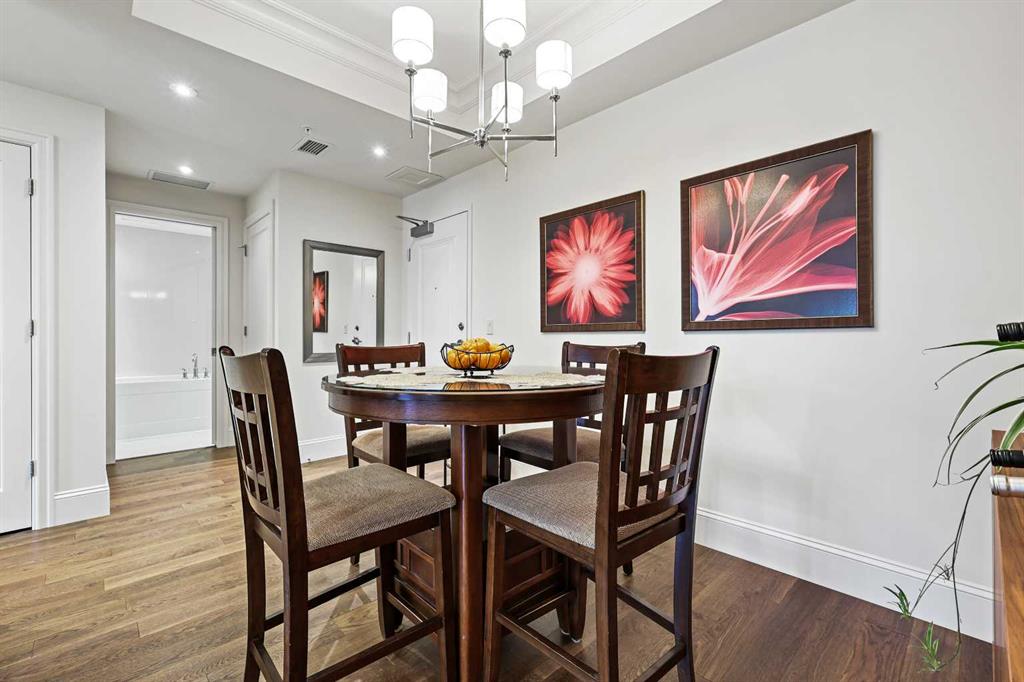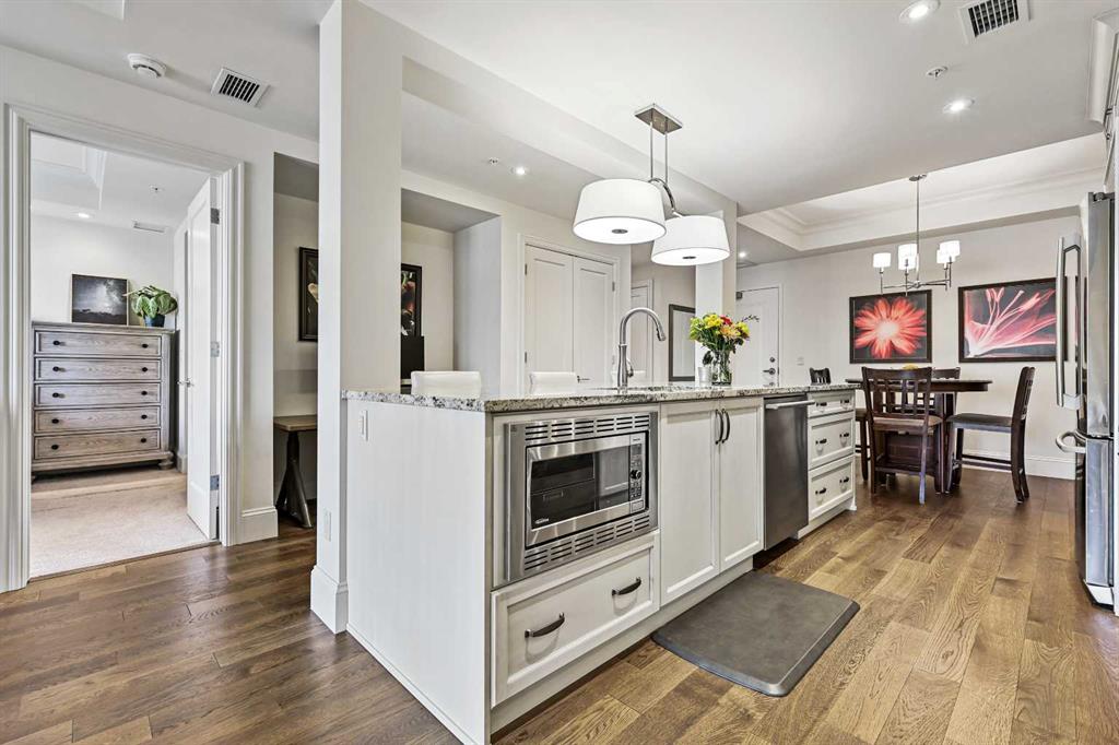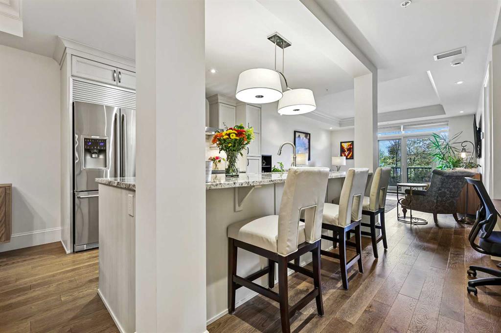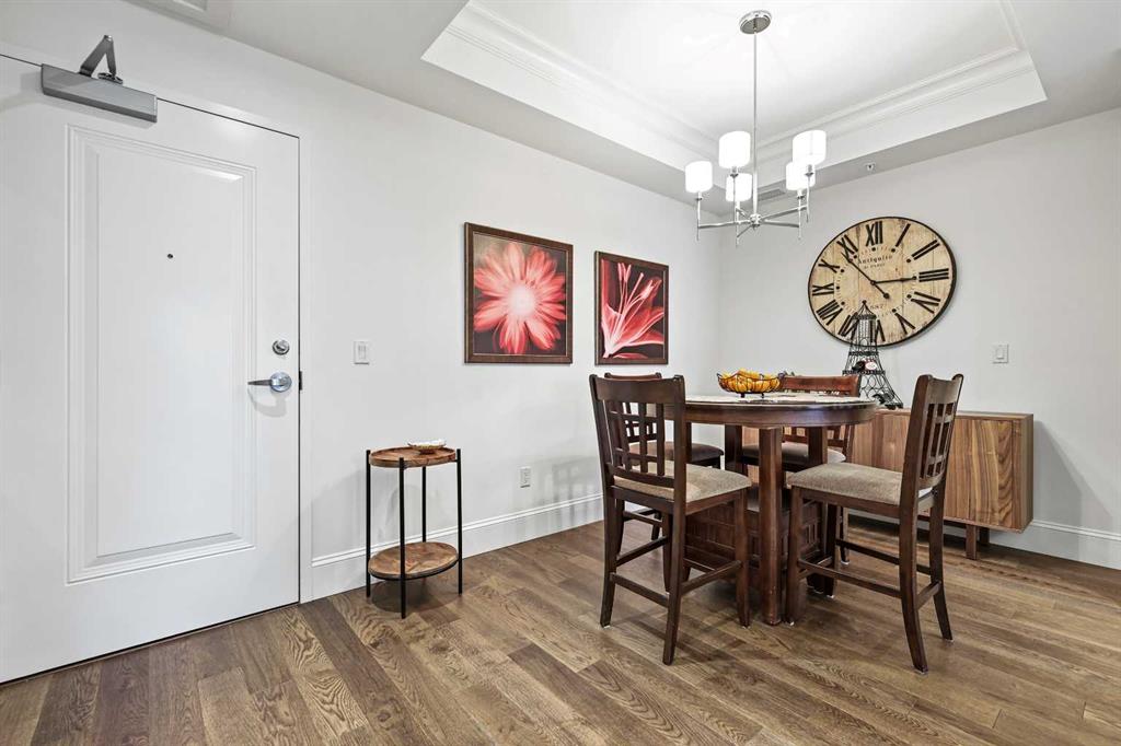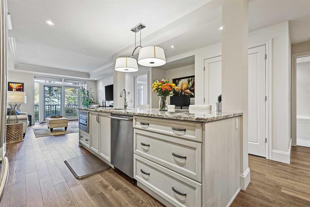 Welcome to Champagne in Quarry Park, where everyday living meets effortless style in a quiet concrete building. This 1-bedroom, 1-bath condo offers a luxurious and inviting space in one of southeast Calgary’s most desirable communities. From the moment you walk into the building, you’ll notice the attention to detail—from the elegant lobby to the quality craftsmanship that carries through the entire home. Inside, the open layout feels bright and welcoming, with hardwood floors throughout the main living area, tall baseboards, and tray ceilings with crown moulding that add a touch of character. The central kitchen is both functional and stylish, featuring granite counters, a large island with seating, and stainless steel appliances, including a gas range—perfect for cooking and entertaining. On one side, there’s space for a dining table, while the living area on the other opens to sliding patio doors leading to your east-facing patio, where you can enjoy morning light and quiet outdoor time. The spacious bedroom includes a walk-through closet with doors and connects to a well-designed bathroom with a soaker tub and separate glass shower. There’s also a second entry to the bathroom from the main living area for convenience. The suite includes in-suite laundry with full-sized washer and dryer, plus titled underground parking and a storage unit. The heated parkade even has a car wash bay—a small luxury that makes a big difference in Calgary winters. Champagne is pet friendly and known for its solid concrete construction and timeless design, offering a peaceful and comfortable place to call home. The Quarry Park community is one of Calgary’s best-kept secrets, offering the perfect balance of city living and quiet convenience. You’re close to shops, restaurants, schools, and the Remington YMCA, and just steps from river pathways for walking or biking. Commuting is easy with quick access to Deerfoot Trail, Stoney Trail, and downtown. Whether you’re looking for a first home, a downsized lifestyle, or a low-maintenance place that still feels special, this Champagne condo delivers comfort, quality, and a great location—all wrapped up in a community you’ll love to come home to.