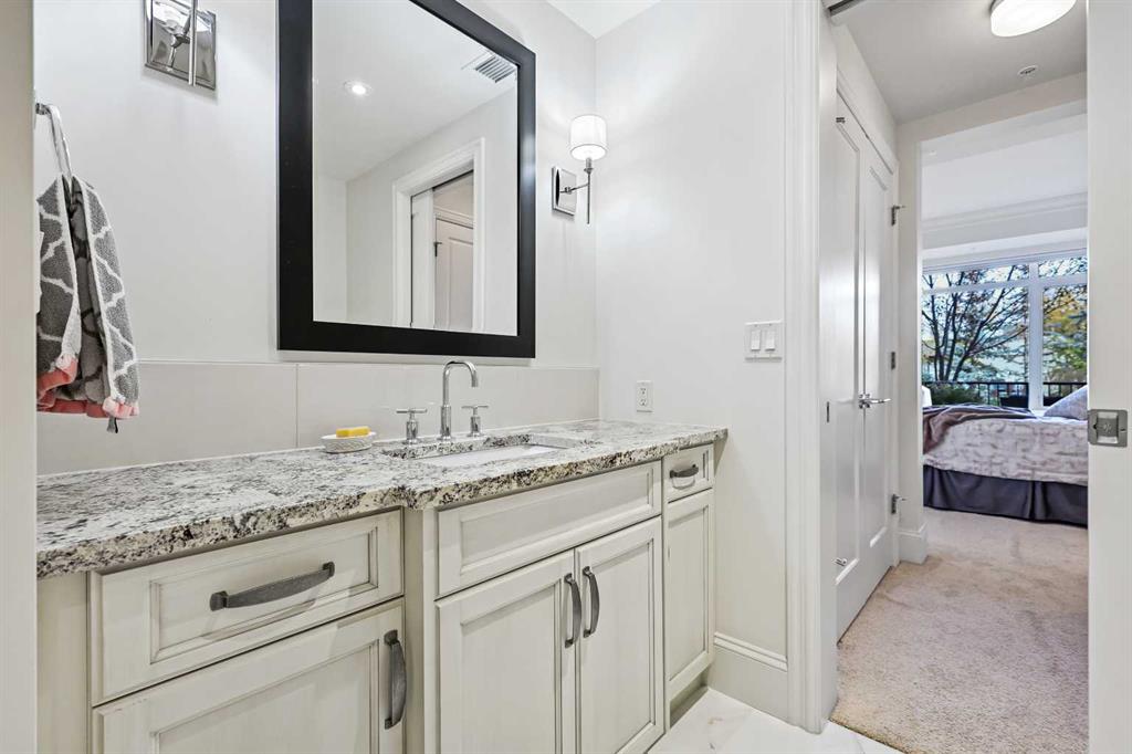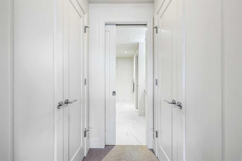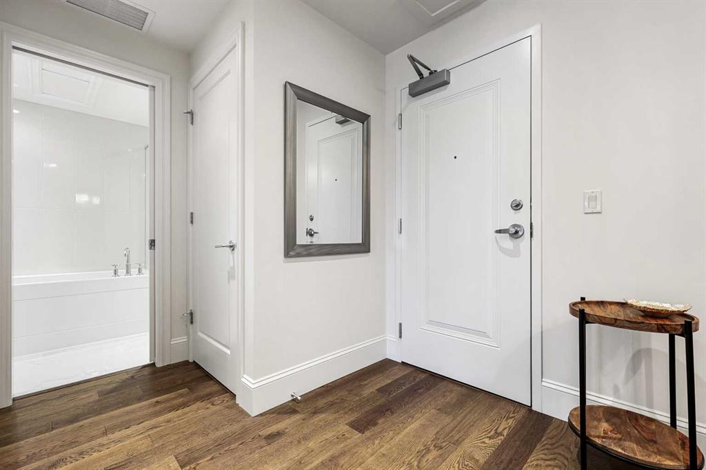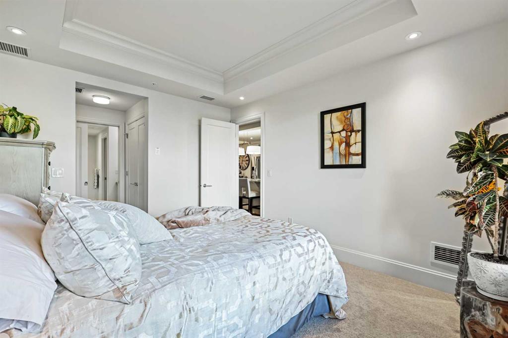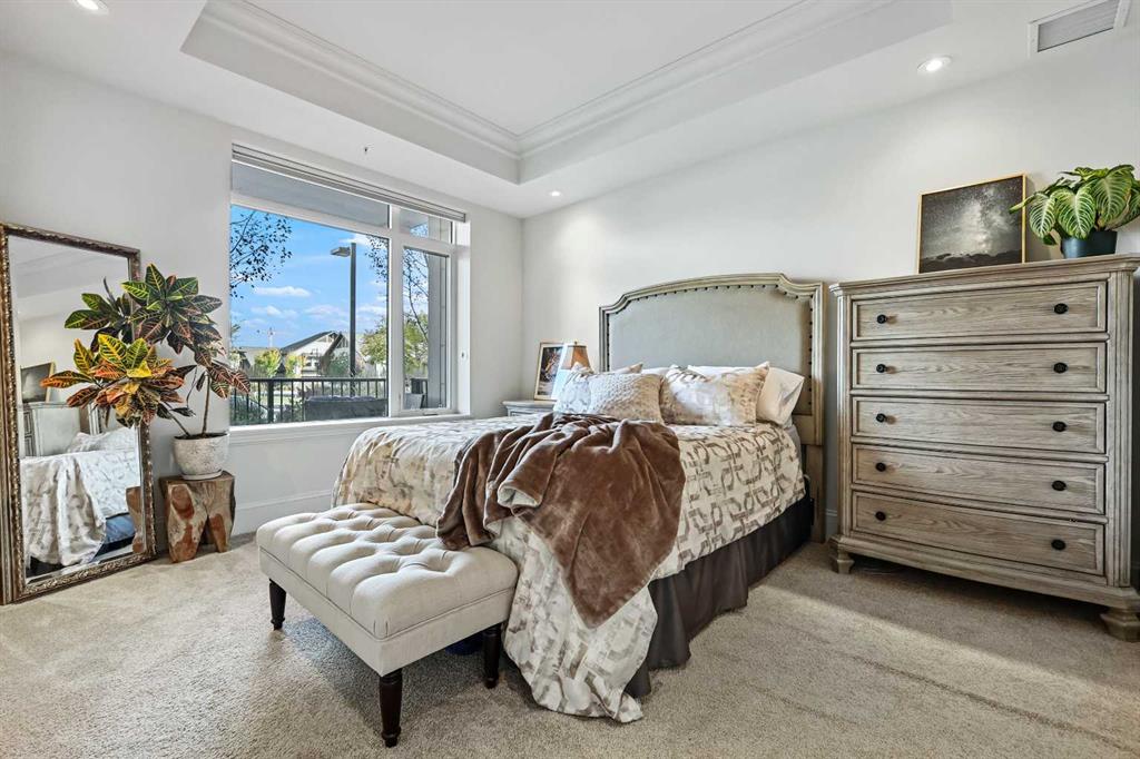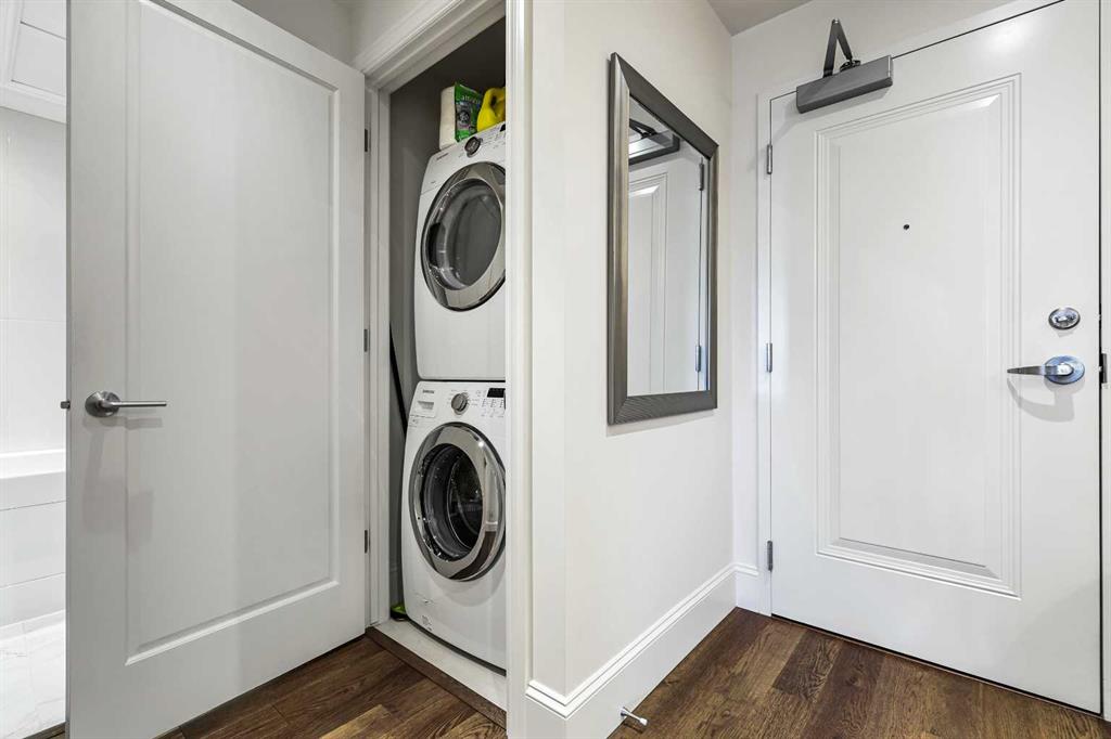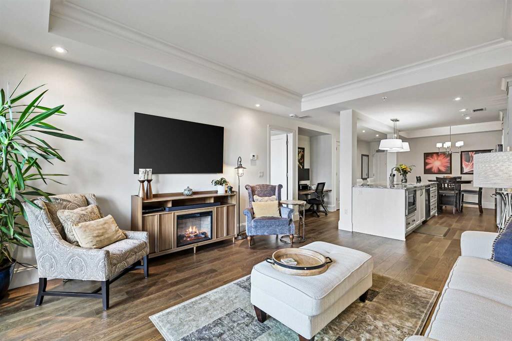 Welcome to Champagne in Quarry Park, where everyday living meets effortless style in a quiet concrete building. This 1-bedroom, 1-bath condo offers a luxurious and inviting space in one of southeast Calgary’s most desirable communities. From the moment you walk into the building, you’ll notice the attention to detail—from the elegant lobby to the quality craftsmanship that carries through the entire home. Inside, the open layout feels bright and welcoming, with hardwood floors throughout the main living area, tall baseboards, and tray ceilings with crown moulding that add a touch of character. The central kitchen is both functional and stylish, featuring granite counters, a large island with seating, and stainless steel appliances, including a gas range—perfect for cooking and entertaining. On one side, there’s space for a dining table, while the living area on the other opens to sliding patio doors leading to your east-facing patio, where you can enjoy morning light and quiet outdoor time. The spacious bedroom includes a walk-through closet with doors and connects to a well-designed bathroom with a soaker tub and separate glass shower. There’s also a second entry to the bathroom from the main living area for convenience. The suite includes in-suite laundry with full-sized washer and dryer, plus titled underground parking and a storage unit. The heated parkade even has a car wash bay—a small luxury that makes a big difference in Calgary winters. Champagne is pet friendly and known for its solid concrete construction and timeless design, offering a peaceful and comfortable place to call home. The Quarry Park community is one of Calgary’s best-kept secrets, offering the perfect balance of city living and quiet convenience. You’re close to shops, restaurants, schools, and the Remington YMCA, and just steps from river pathways for walking or biking. Commuting is easy with quick access to Deerfoot Trail, Stoney Trail, and downtown. Whether you’re looking for a first home, a downsized lifestyle, or a low-maintenance place that still feels special, this Champagne condo delivers comfort, quality, and a great location—all wrapped up in a community you’ll love to come home to.
