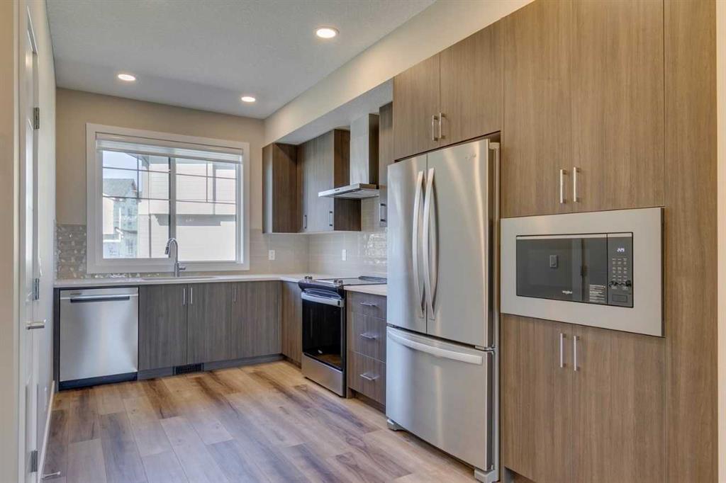 Welcome to Chelsea Court and the impressive “Regent” townhome by Trico Homes, one of Calgary’s premier local builders. This thoughtfully designed residence features 2 bedrooms, 2.5 bathrooms, and over 1,301 square feet of well-planned living space. On the entry level, you’ll find a versatile closed flex room with a closet and an oversized one-car attached garage. The main floor offers a private front deck with a gas line, perfect for enjoying views of the green spaces and walkways. Inside, the open-concept layout is highlighted by 9-foot ceilings, four flush-mounted LED lights in the great room, and a modern kitchen equipped with quartz countertops and semi-built-in stainless-steel appliances. Additional features include a rough-in for air conditioning and zebra blinds on all windows to ensure comfort throughout the year. Upstairs, the owner’s bedroom includes a spacious walk-in closet and a private 4-piece ensuite. Photos are representative